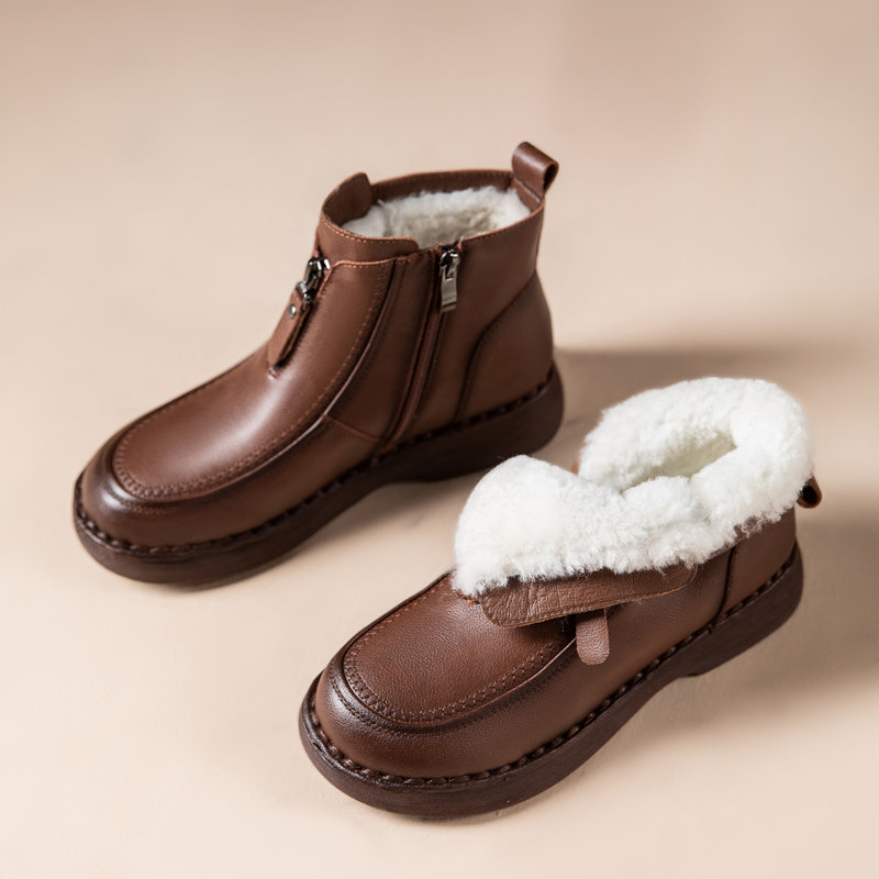 牛皮~骄屿复古圆头雪地靴加绒保暖毛毛棉靴两穿平底棕色勃肯短靴