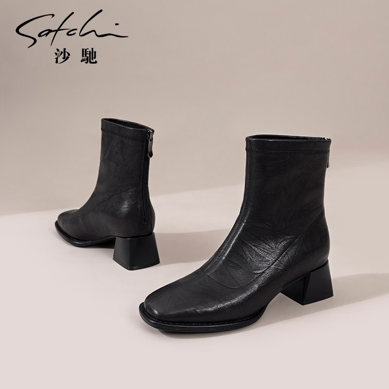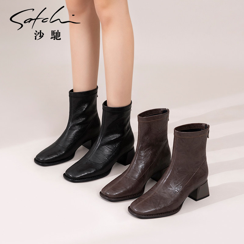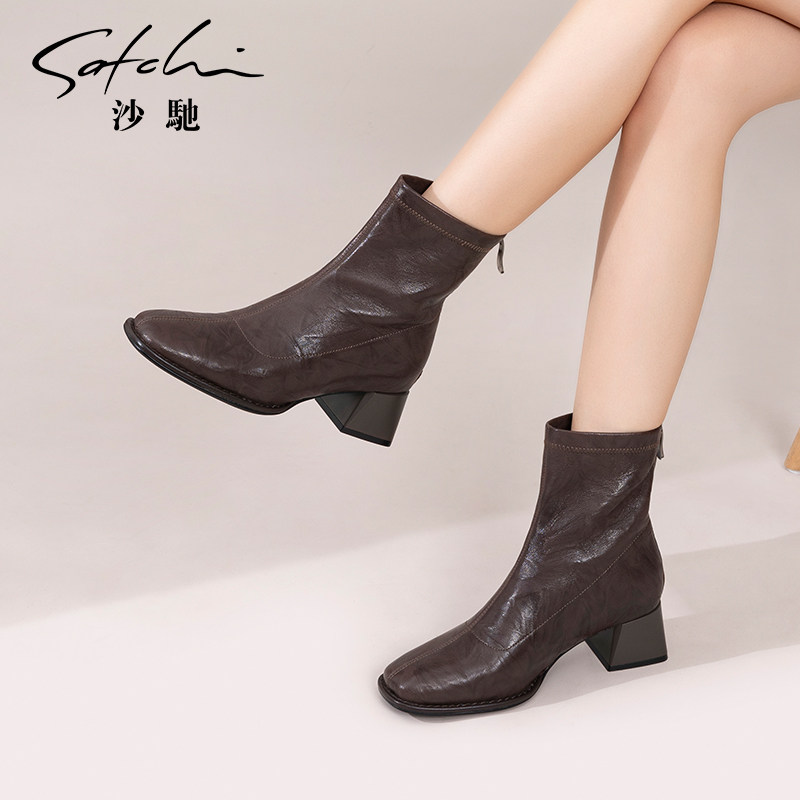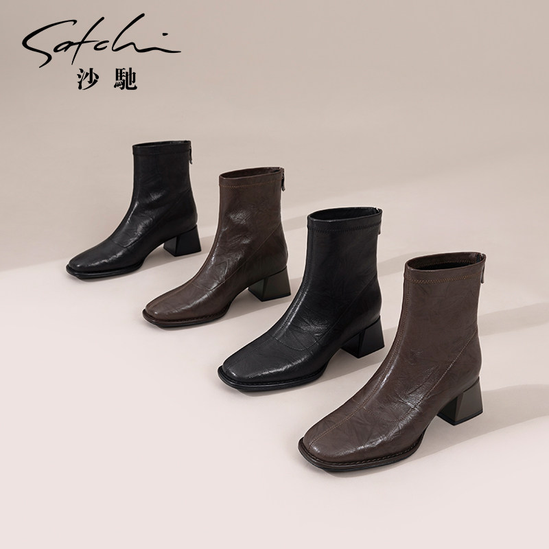 沙驰女鞋个性手抓纹羊皮短靴2025年秋冬新款妈妈通勤时装靴瘦瘦靴