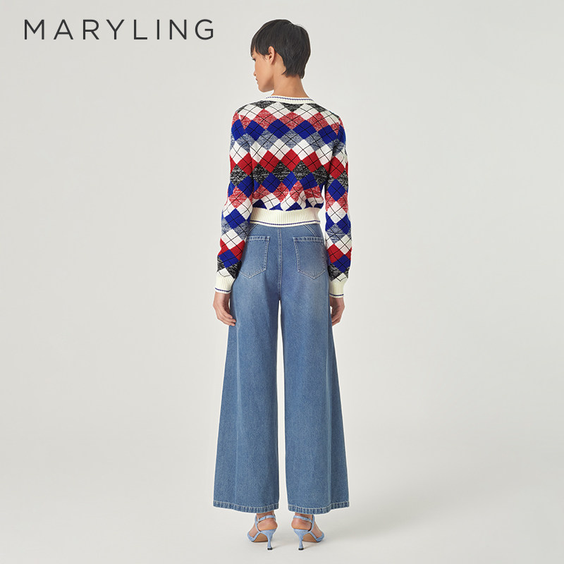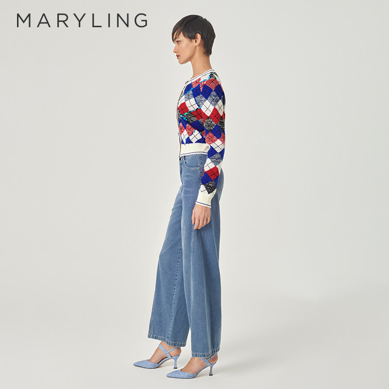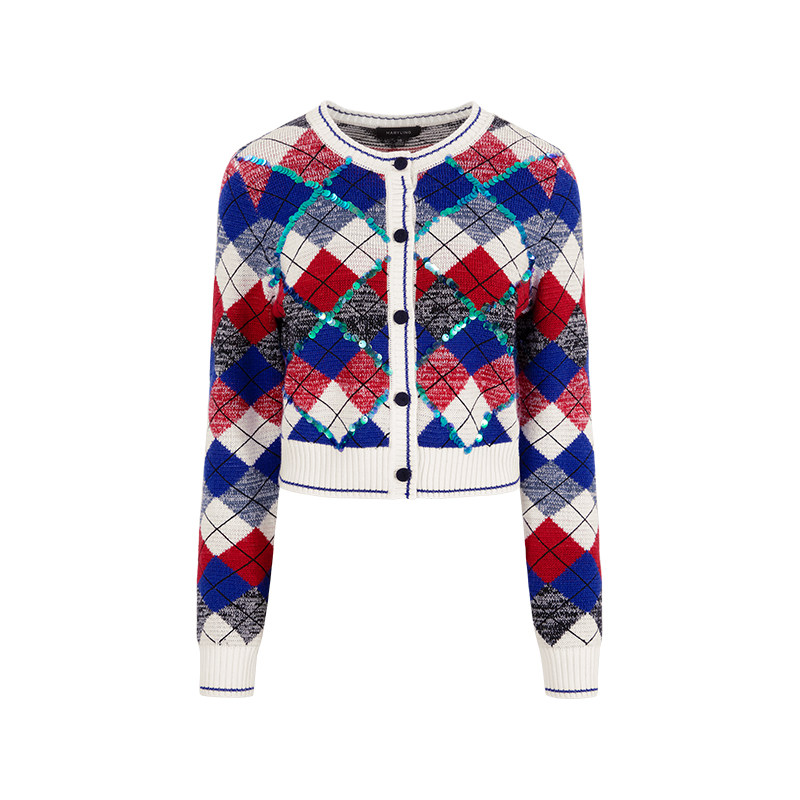 MARYLING玛俪琳春秋新品复古菱形格纹上衣圆领亮片绵羊毛针织开衫