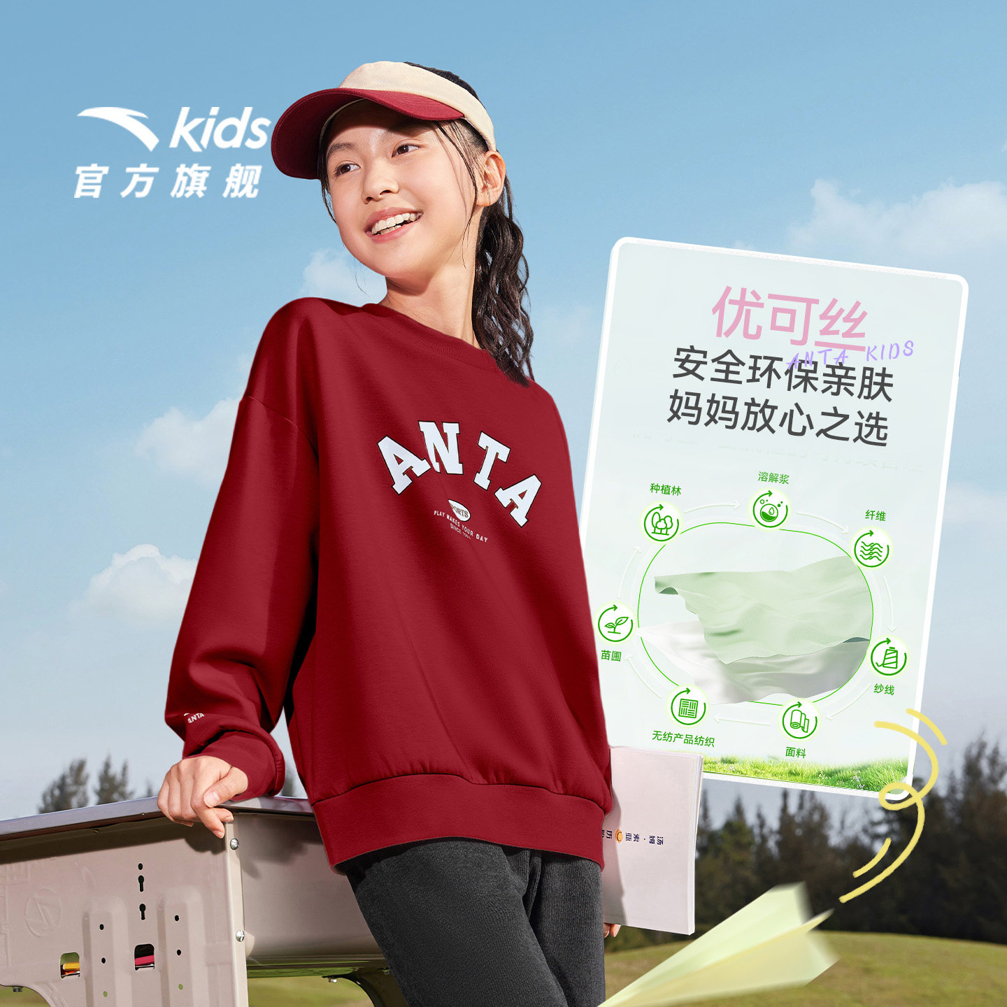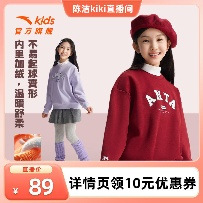 安踏儿童卫衣女童套头衫| 女童卫衣红色2025新款加绒长袖字母卫衣