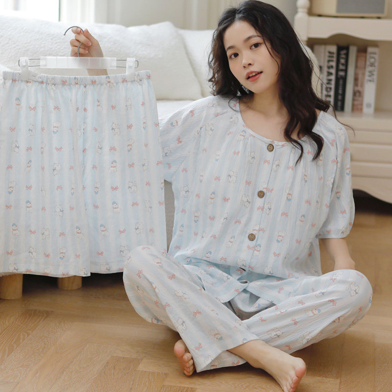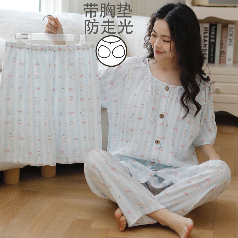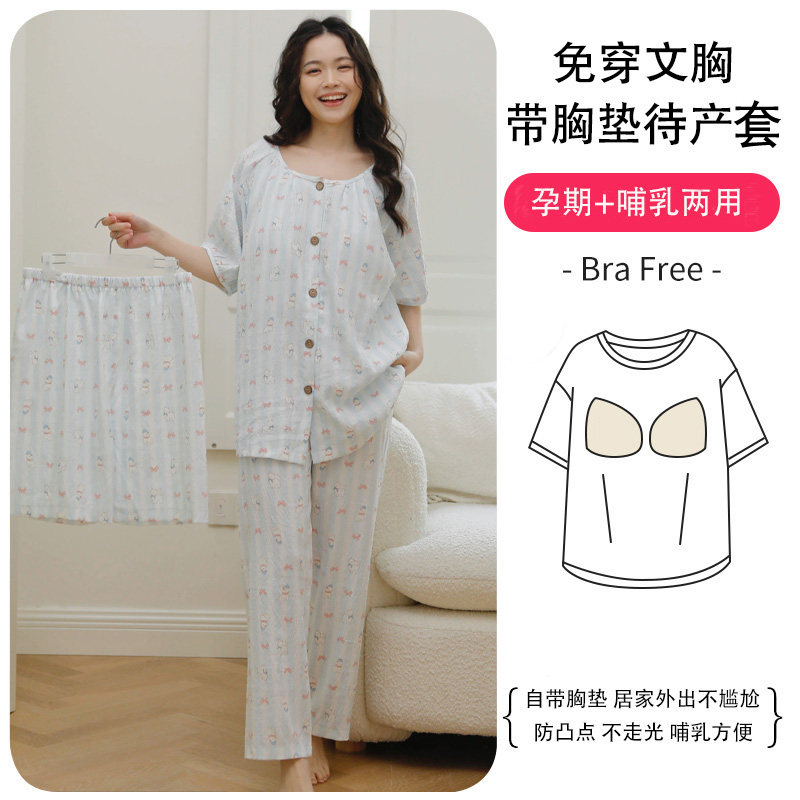 婧麒三件套月子服夏季哺乳衣产后带胸垫喂奶孕妇睡衣产妇家居服装