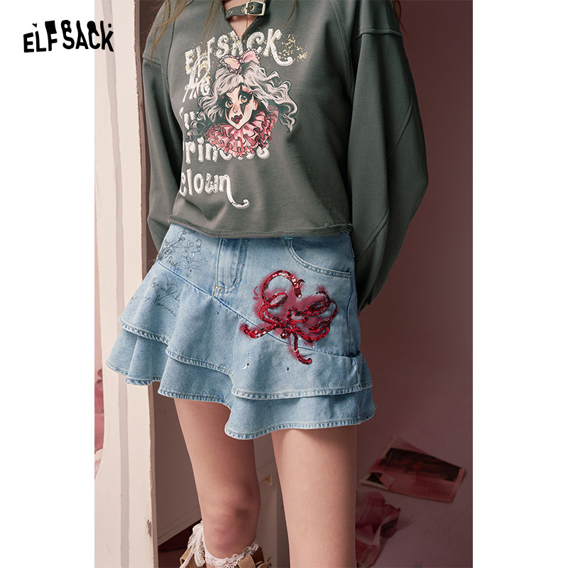 妖精的口袋重工蝴蝶结珠片半身裙女26春夏新款甜美荷叶边牛仔短裙