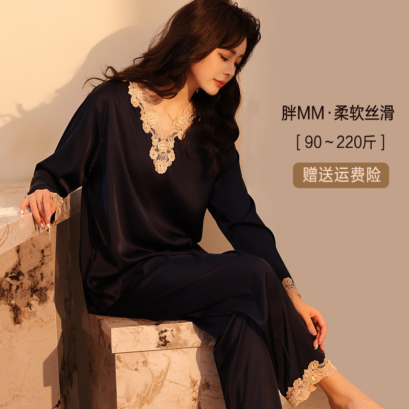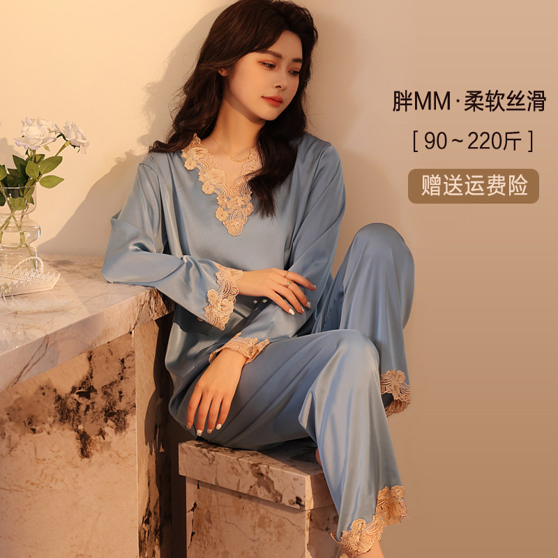 加肥加大码200斤女春秋胖mm冰丝宽松休闲家居服长袖长裤睡衣套装