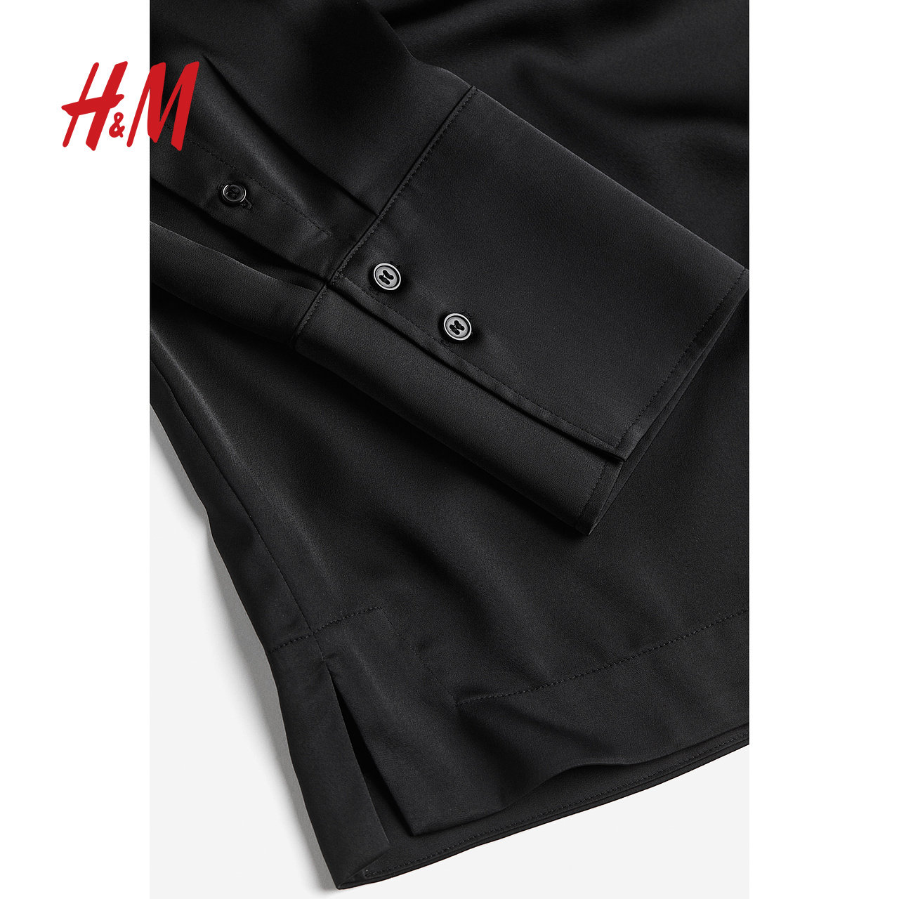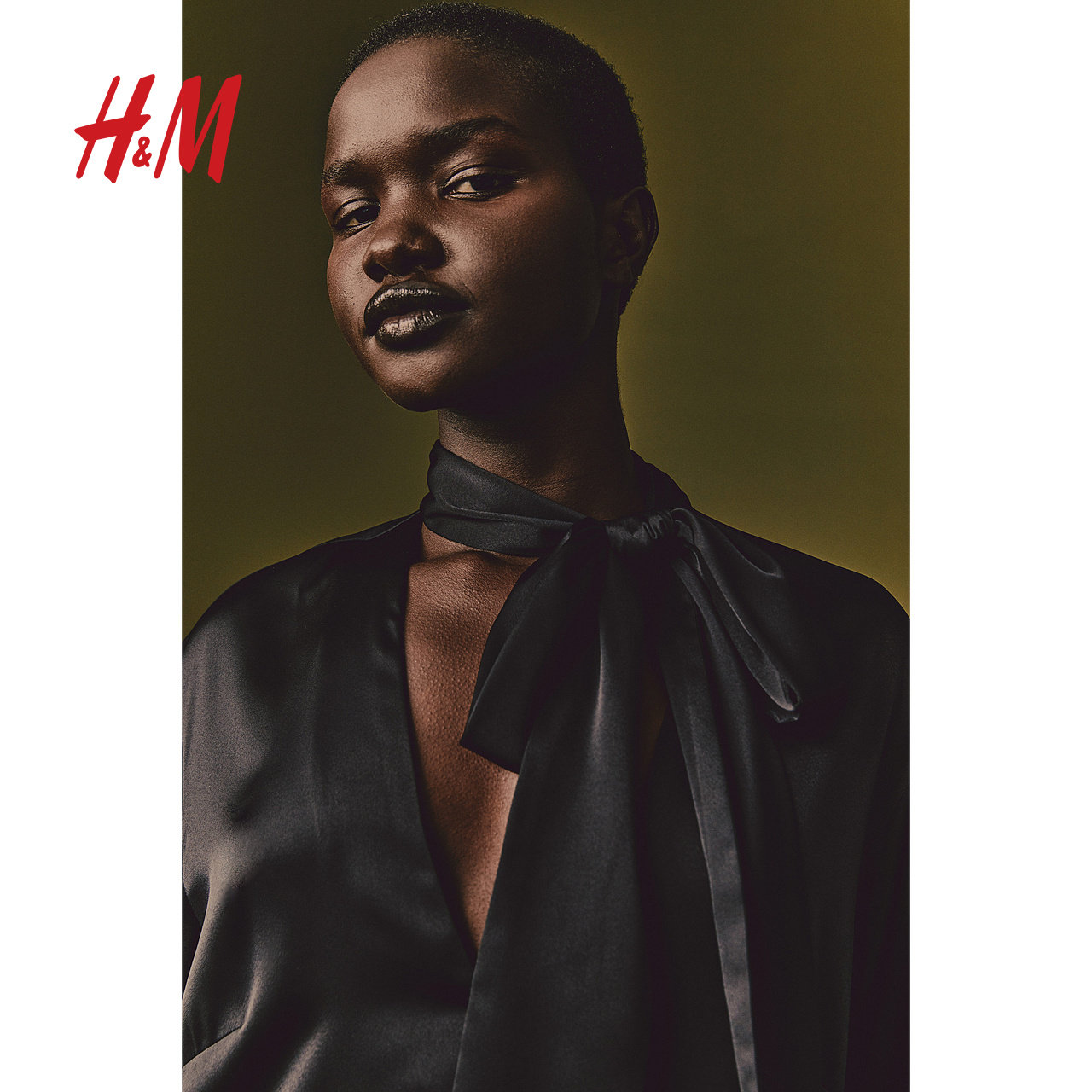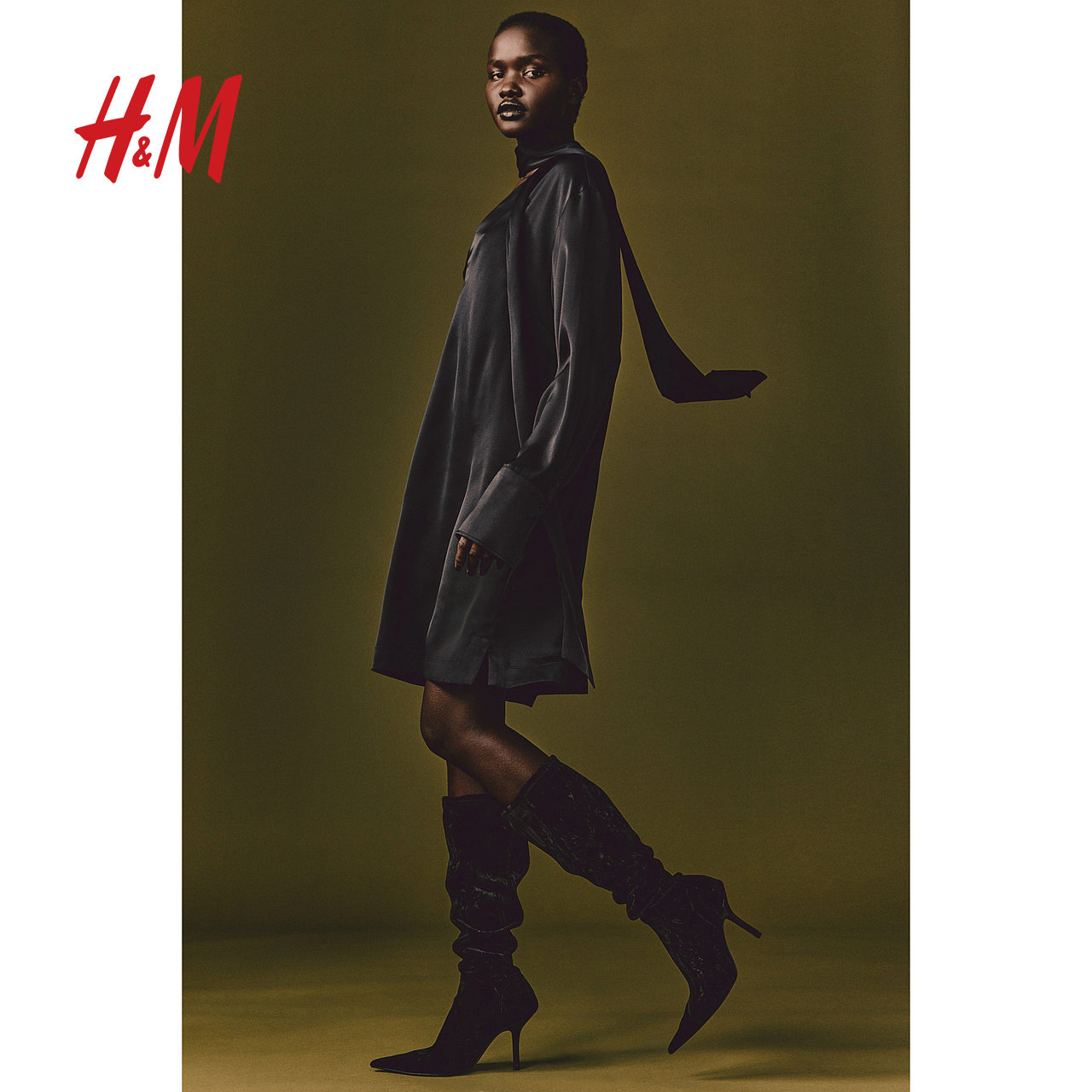 HM女装连衣裙冬季时尚气质垂坠系带缎质V领长裙1207292