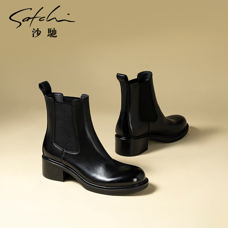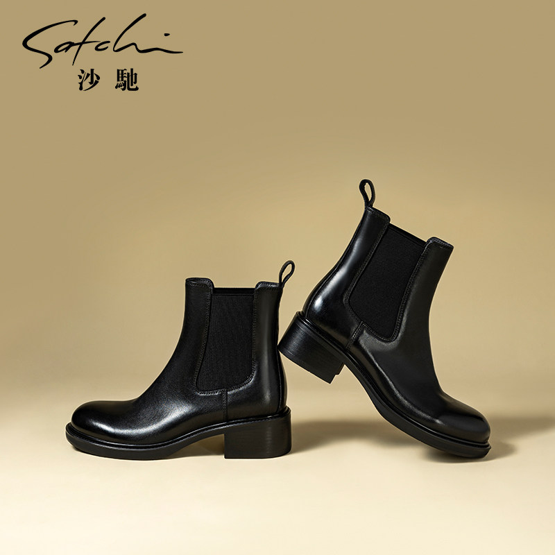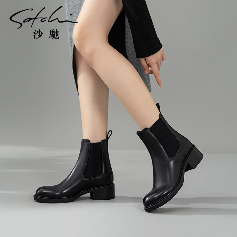 沙驰女鞋低跟粗跟短筒切尔西靴女2025新款时尚真皮秋冬休闲短靴子