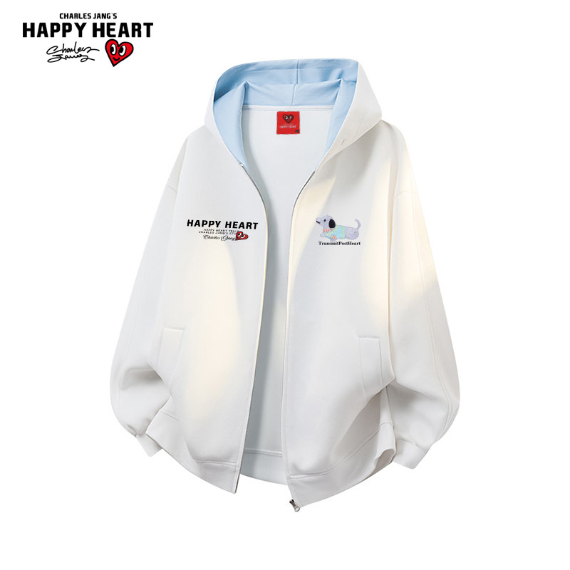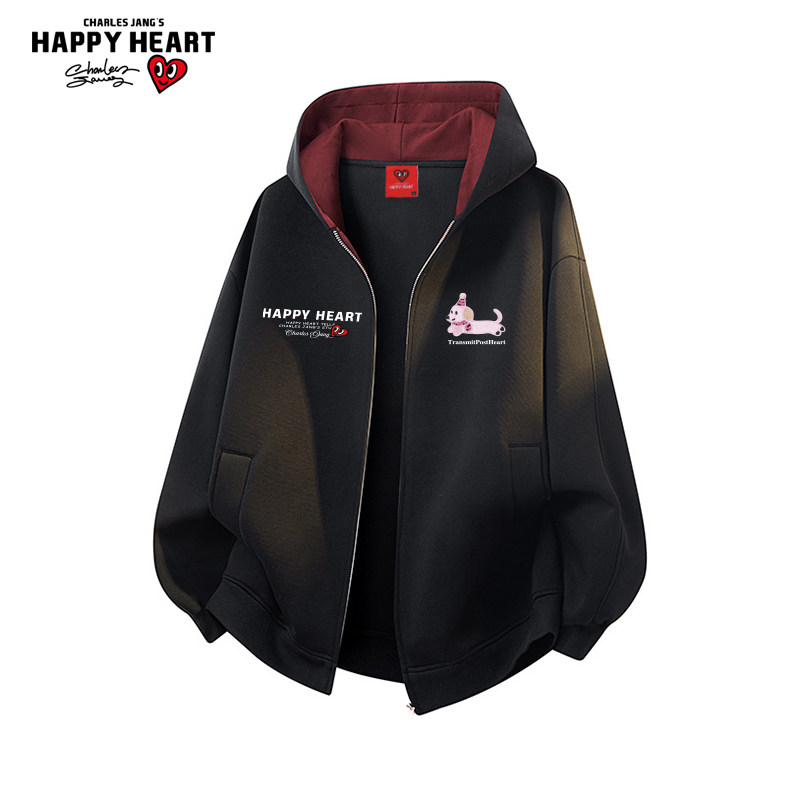 查尔斯桃心美式腊肠狗撞色连帽开衫卫衣男春秋季宽松休闲情侣外套