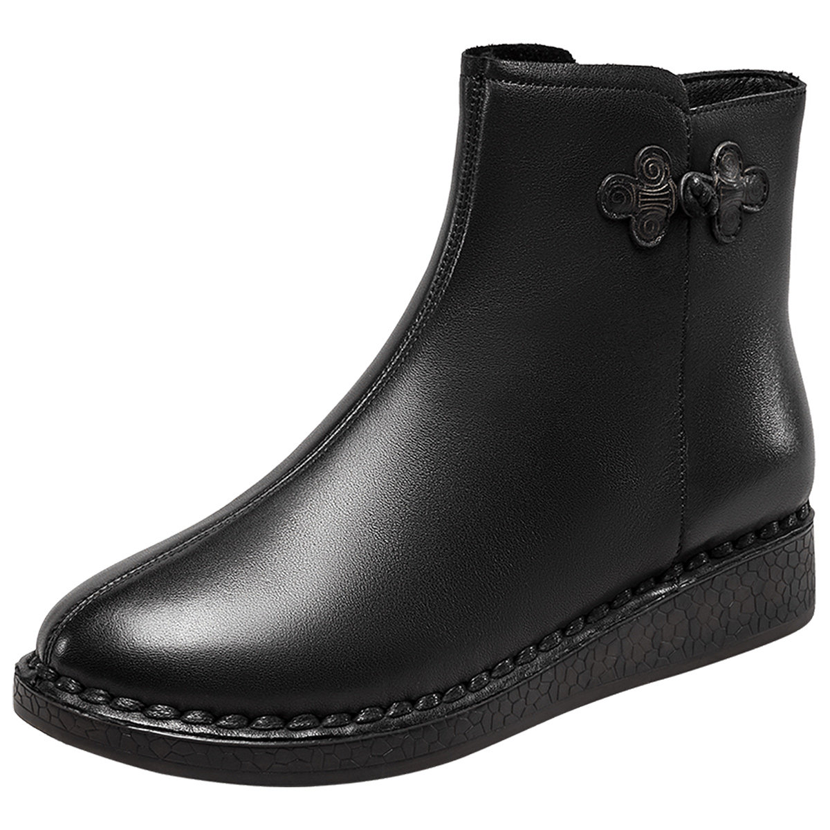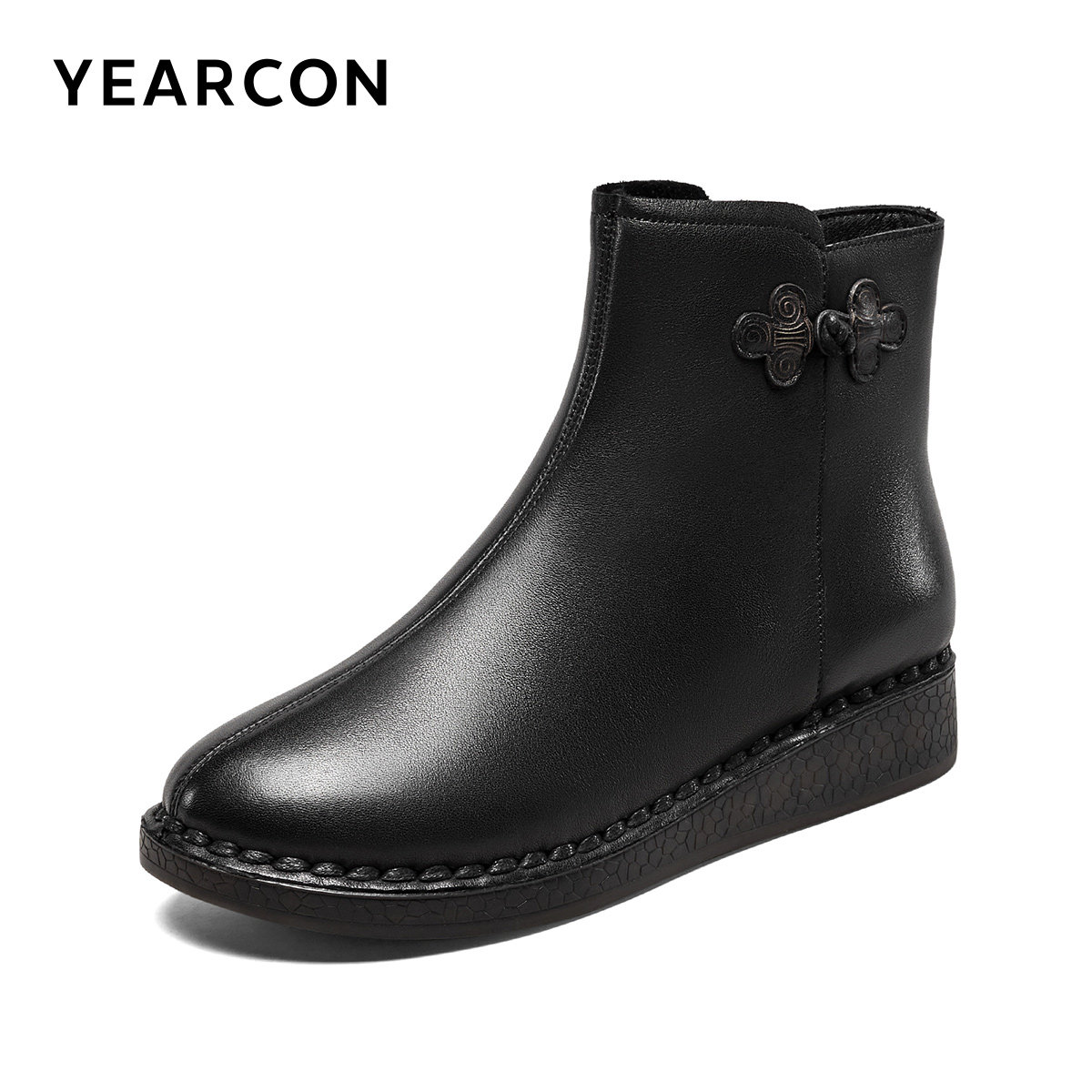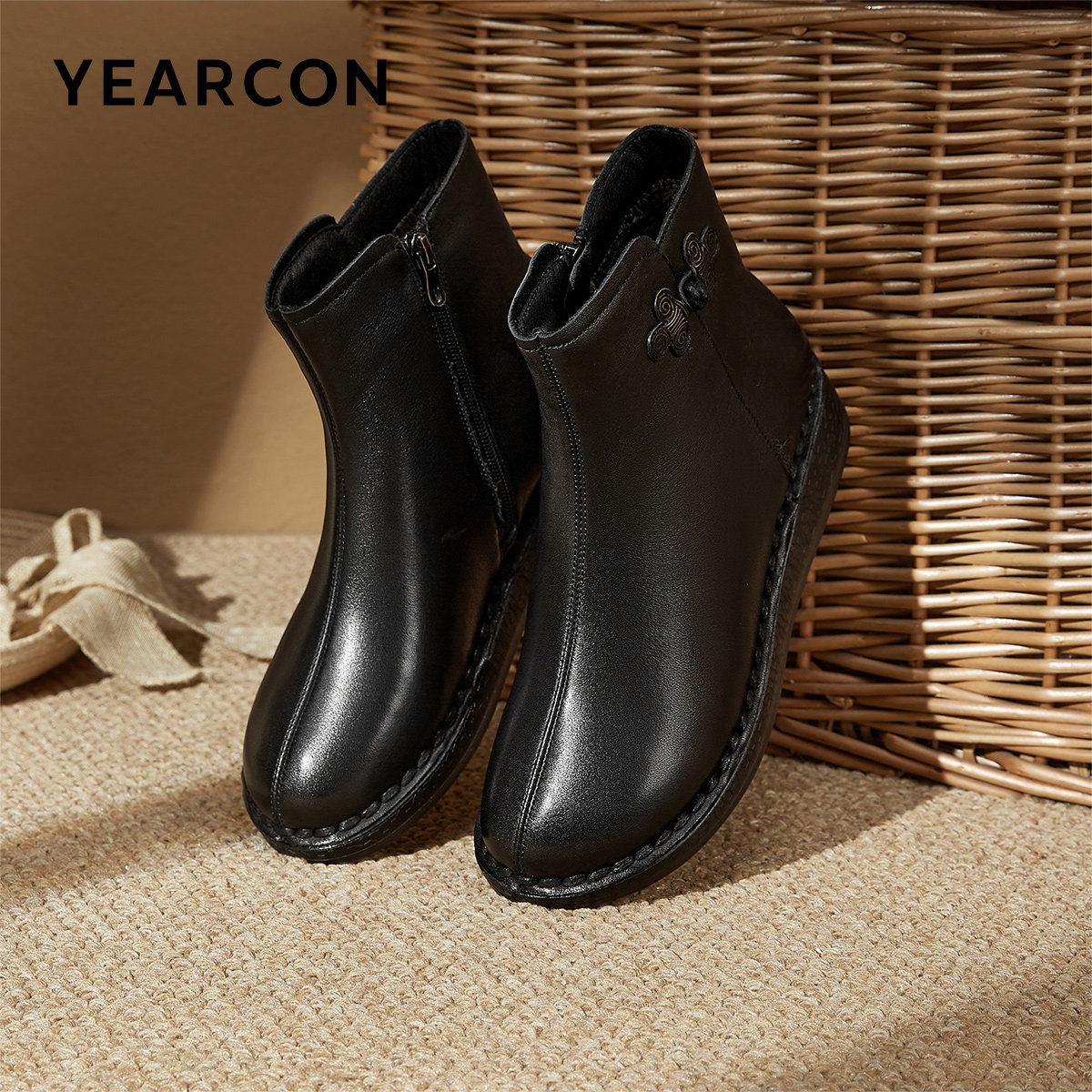 意尔康女鞋冬季靴子短靴真皮短筒皮靴中老年妈妈棉鞋加绒保暖皮鞋