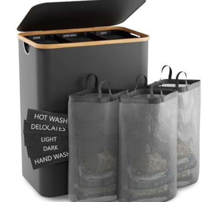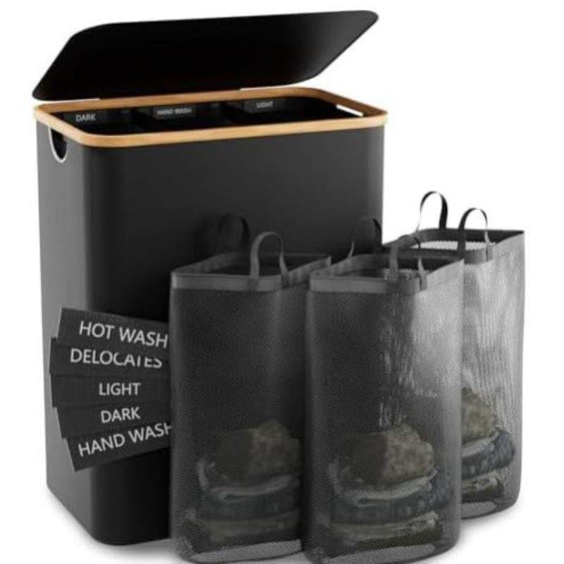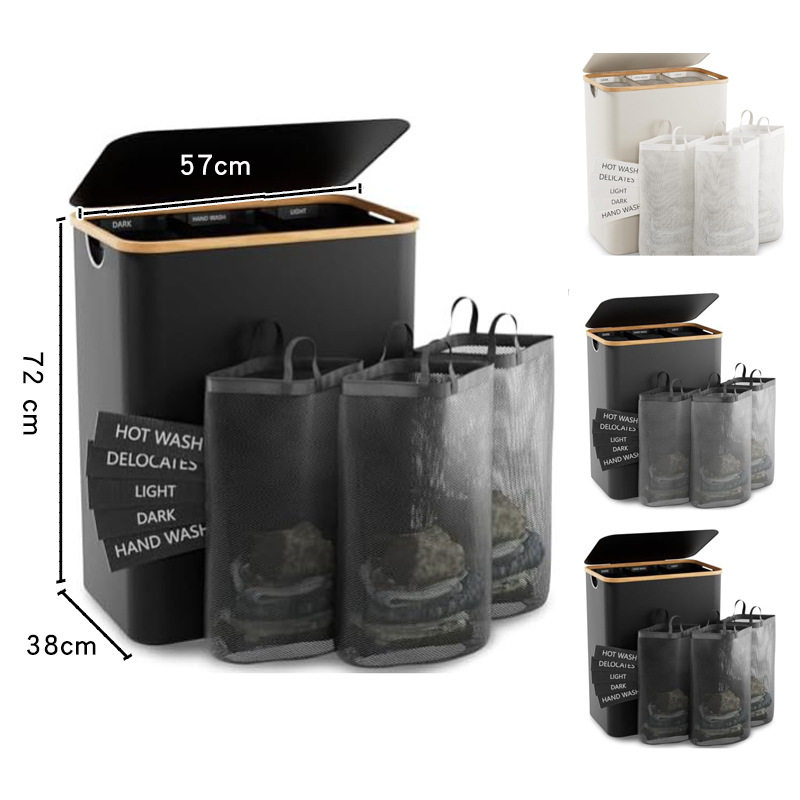 跨境 日式竹木脏衣篮卧室配内袋带盖可折叠脏衣服收纳筐浴室分隔