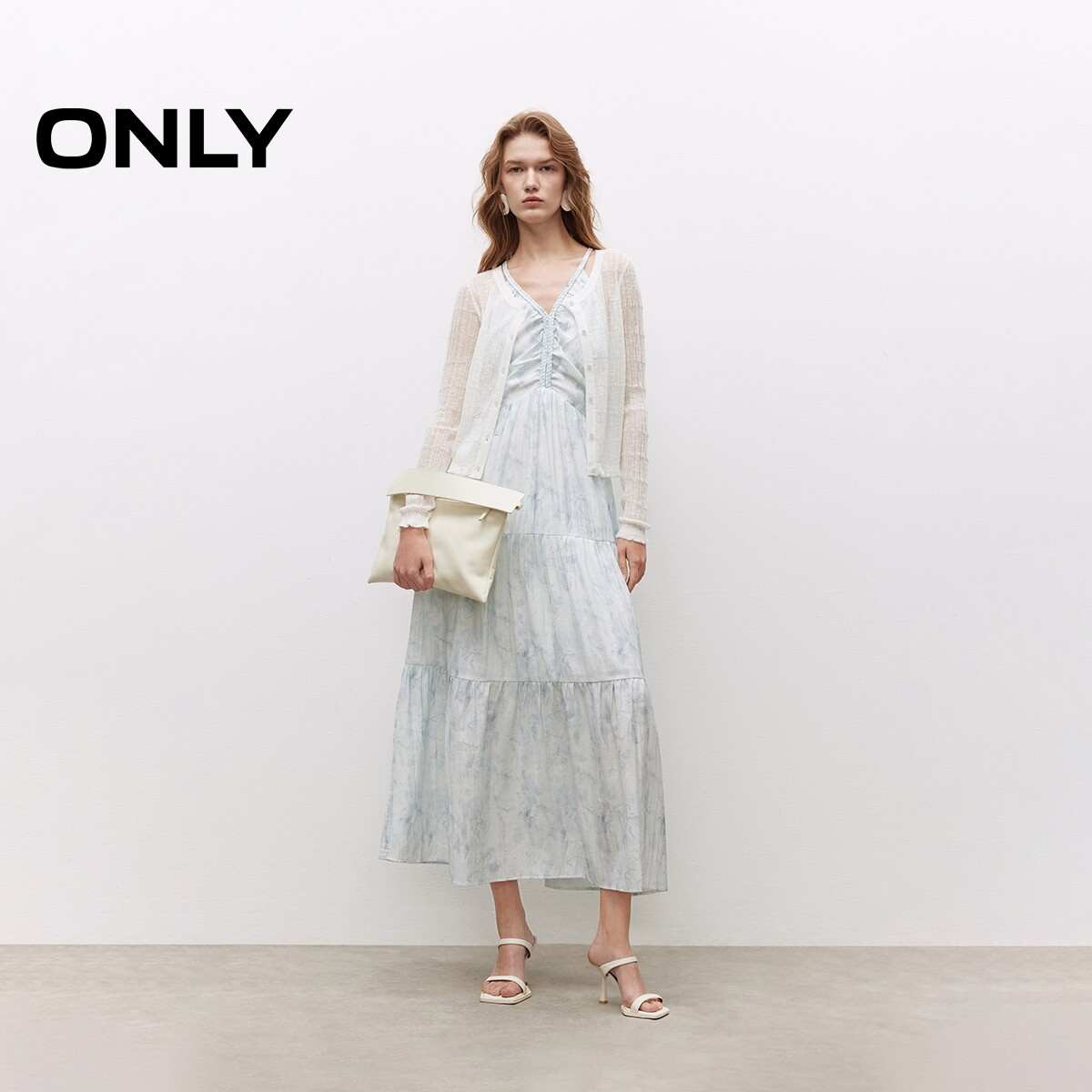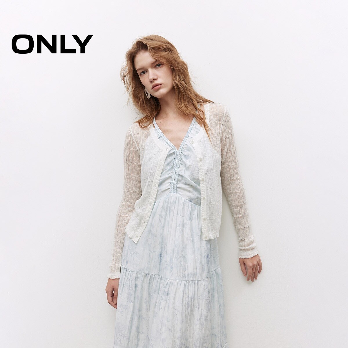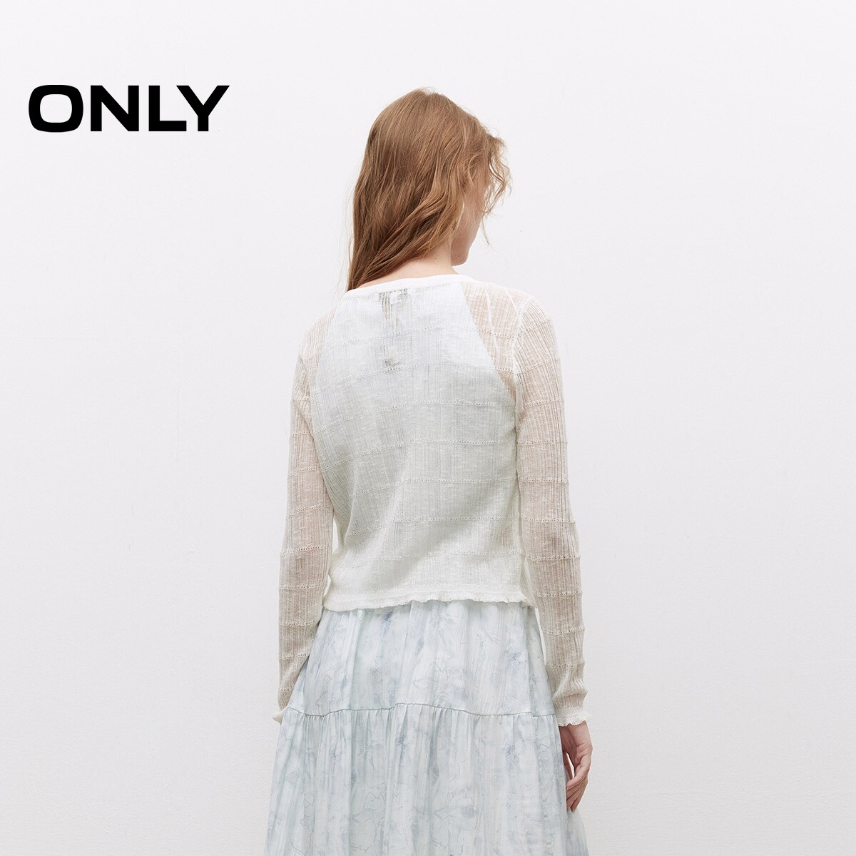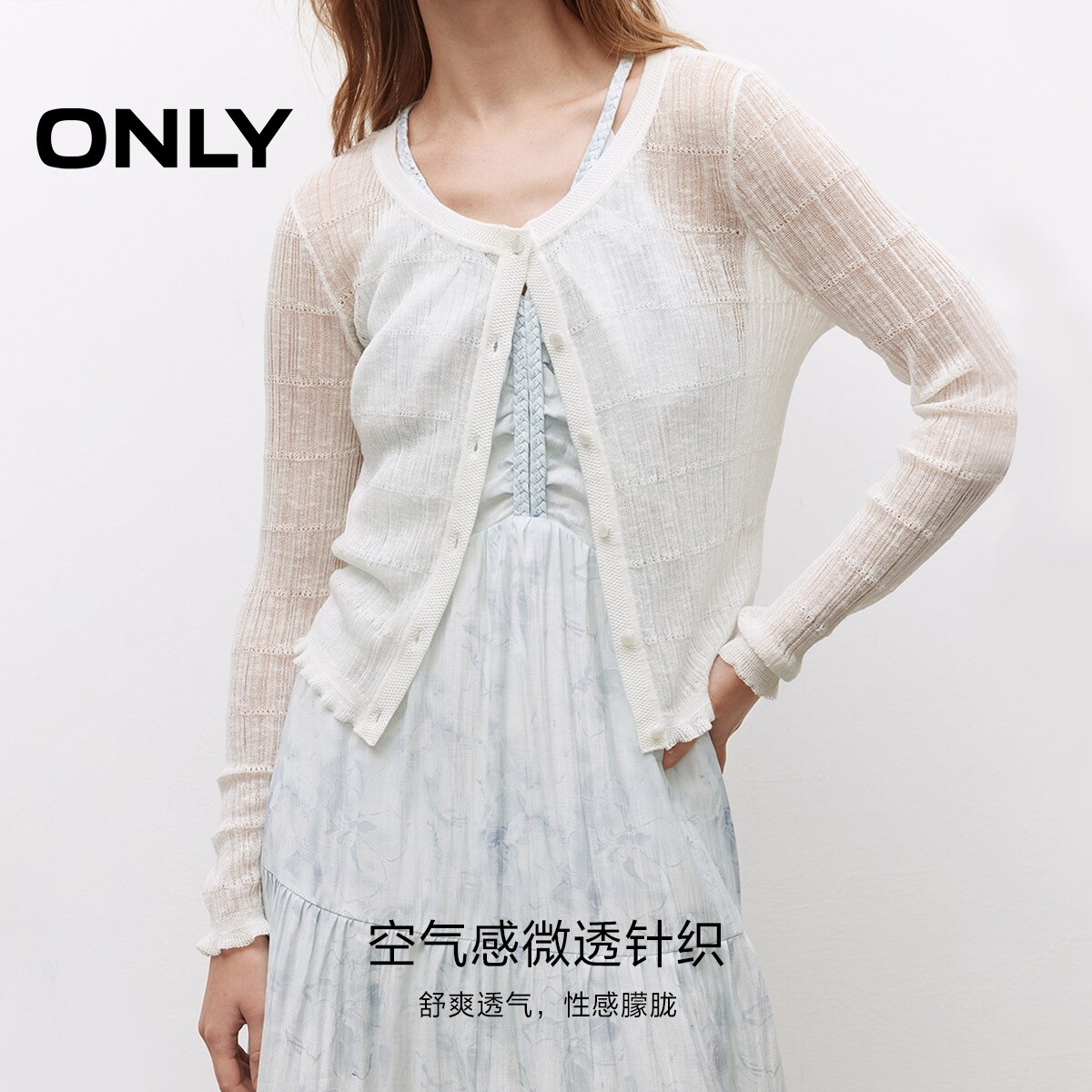 【ONLY奥莱】春季柔软微透轻薄圆领甜美木耳边纯色开衫针织衫女