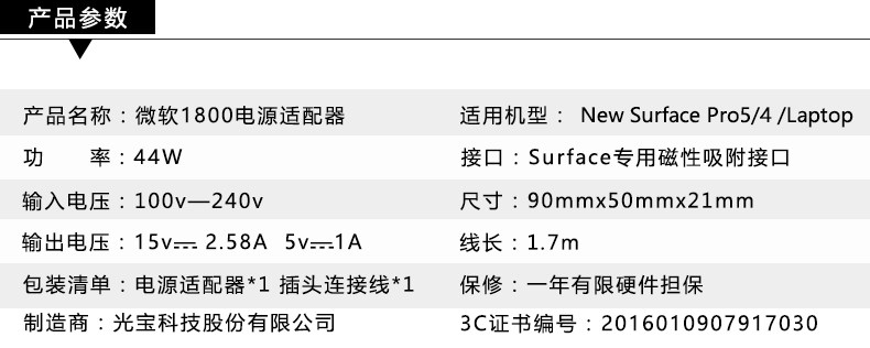 微软 44W 充电器 Surface Pro3 4 5 1769 1800电源适配器15V2.58A