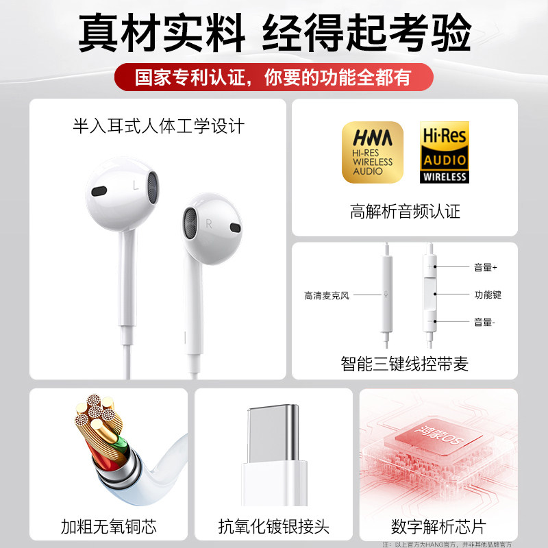 官方正品睡眠耳机有线入耳式typec接口高音质降噪k歌游戏手机圆口