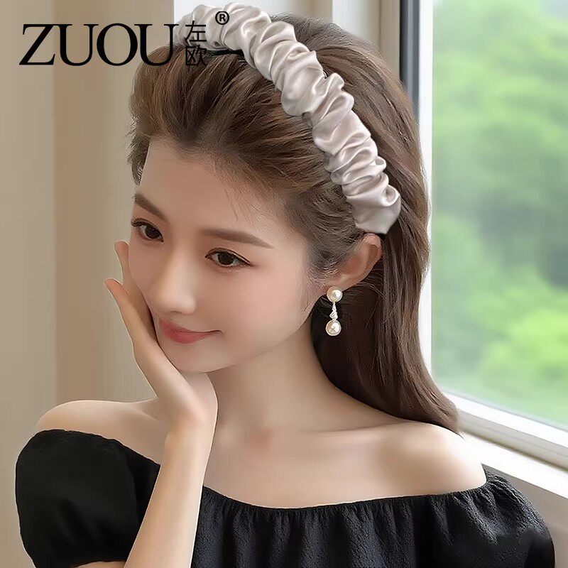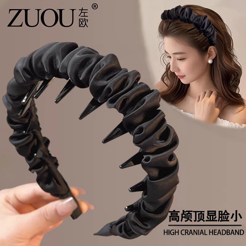 宽边皱褶高颅顶发箍女款带齿宽版蓬松显发量神器头箍黑色缎面发卡