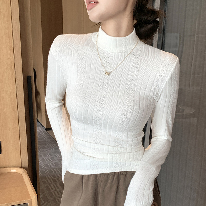 半高领针织打底衫女2025新款秋冬季内搭修身坑条肌理杏色长袖上衣