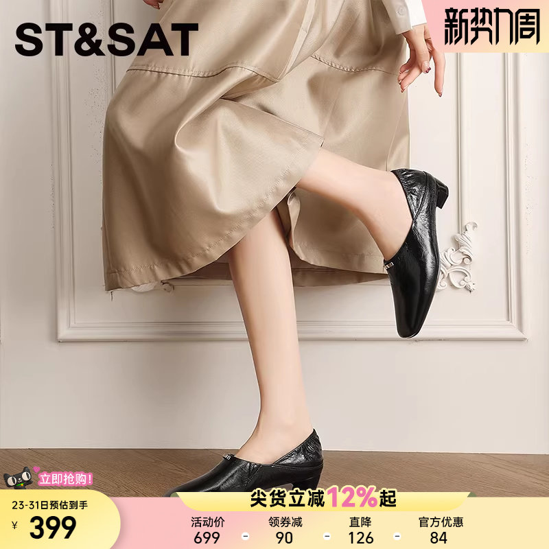 星期六法式小众设计感复古单鞋女方头坡跟低跟一脚蹬牛皮小皮鞋女