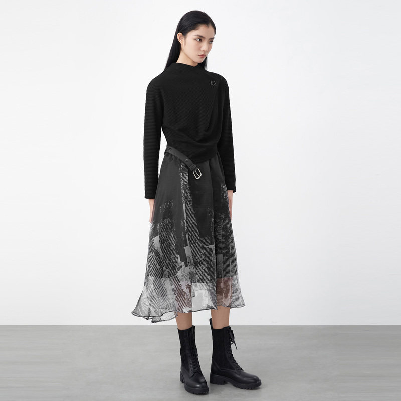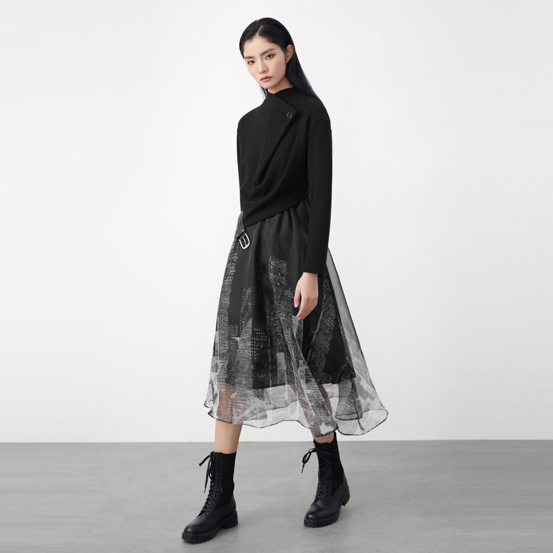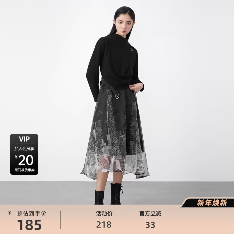 sdeer圣迪奥女装半高领印花网纱针织两件套吊带连衣裙S21481221