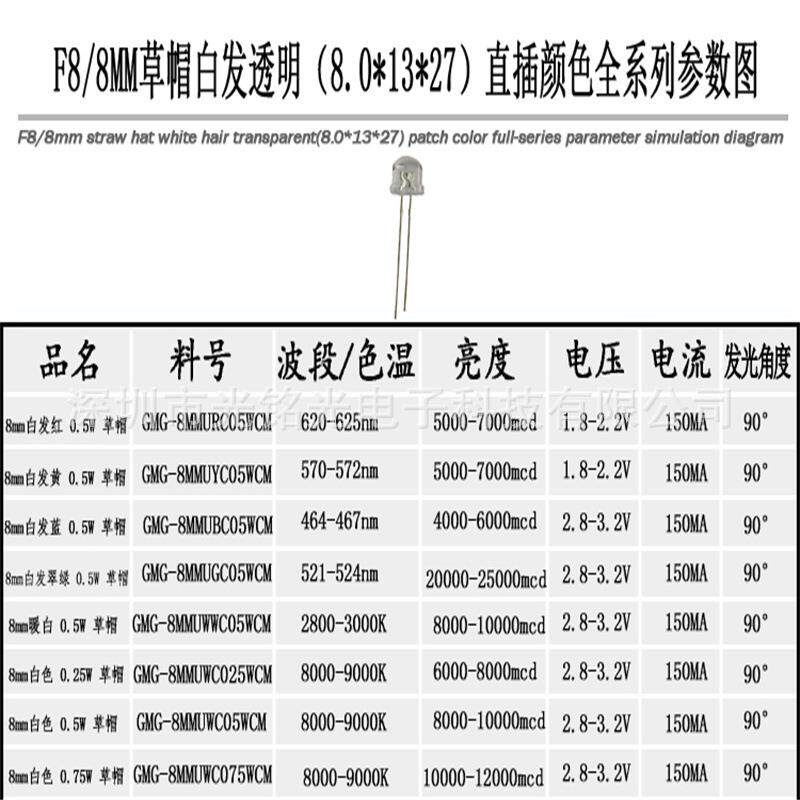 F8/8mm暖白0.5W草帽发光二极管草帽暖白直插灯珠颜色支持定作