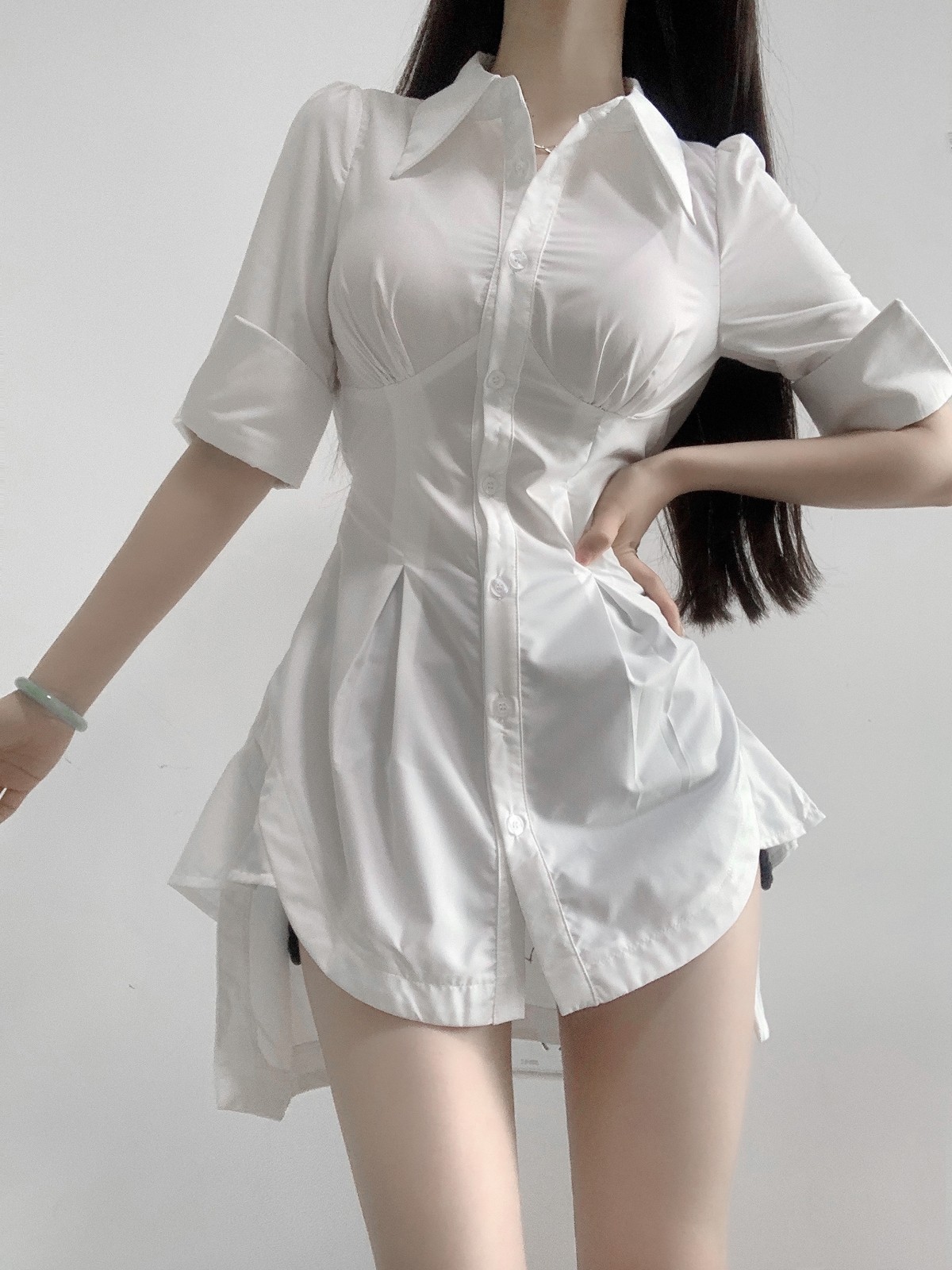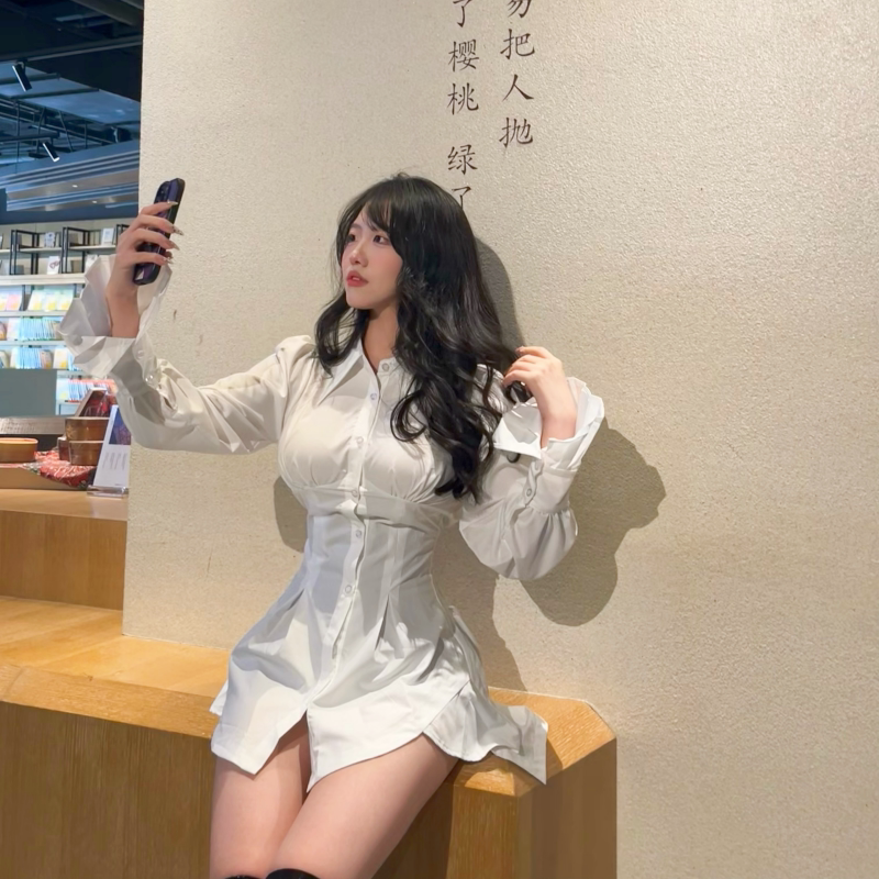 iqcq气球熊学院风白色Polo领衬衫裙女春夏收腰显瘦不规则连衣裙