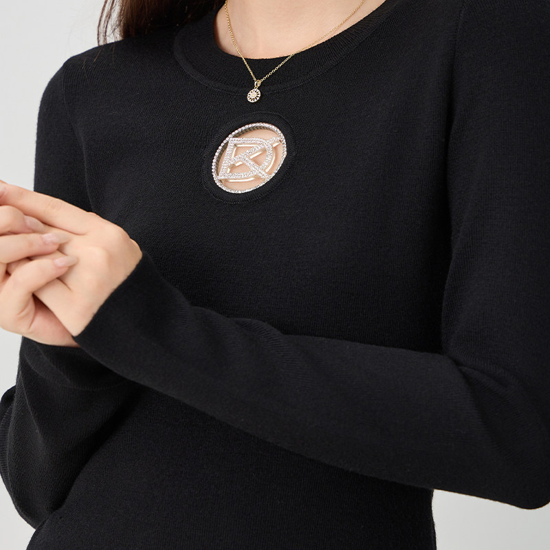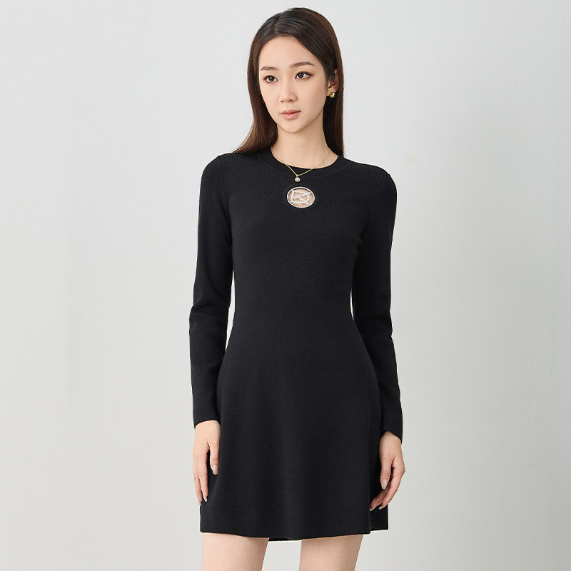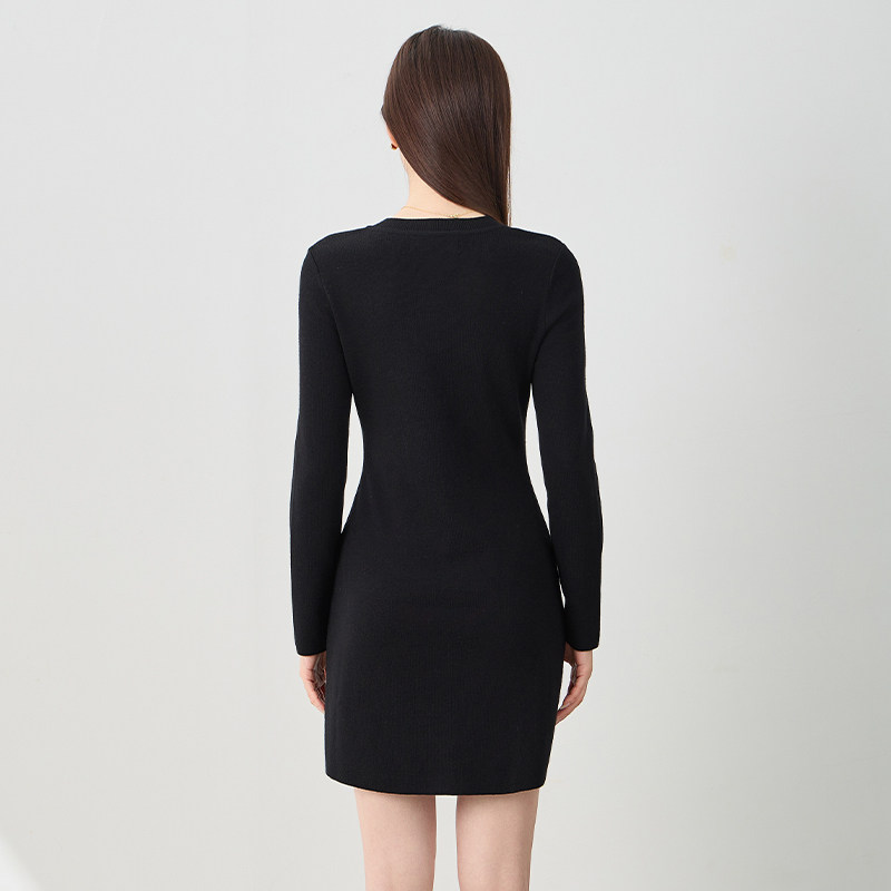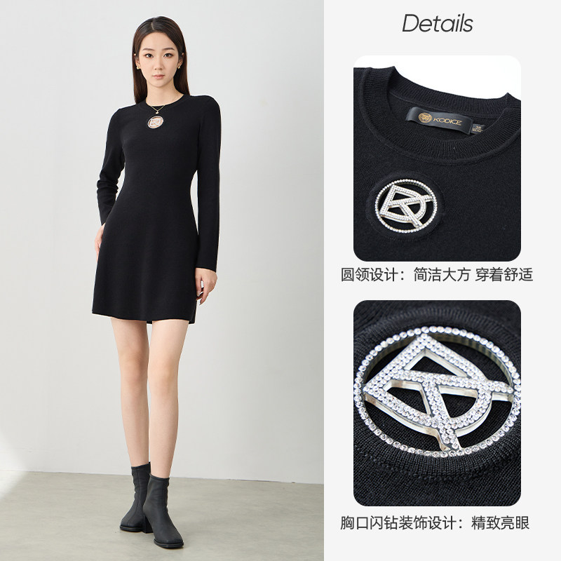 kodice秋冬新品女装黑色绵羊毛混纺圆领收腰针织连衣裙子长袖时尚