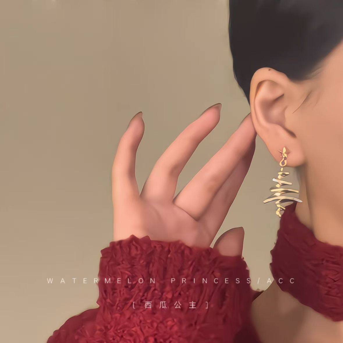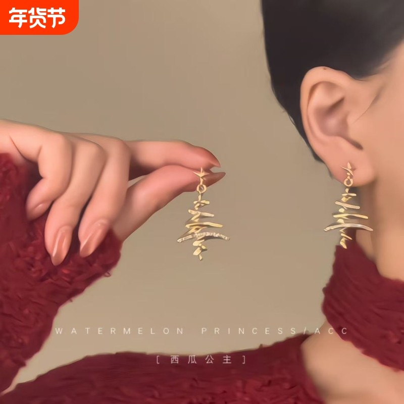 圣诞2025新款轻奢星星圣诞树耳钉小众高级感圣诞节耳饰流苏红色