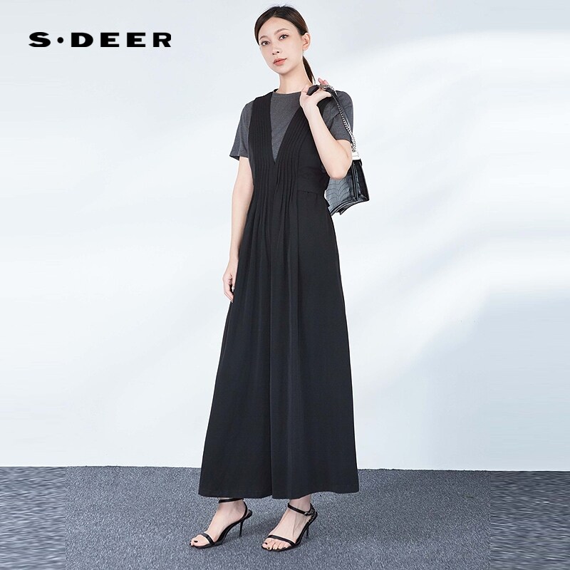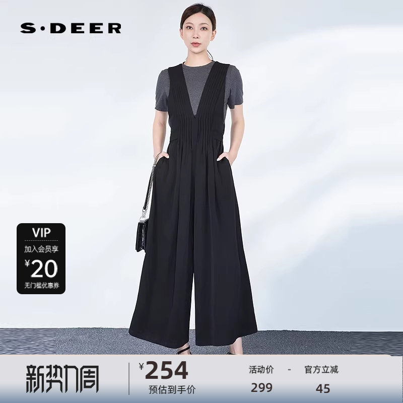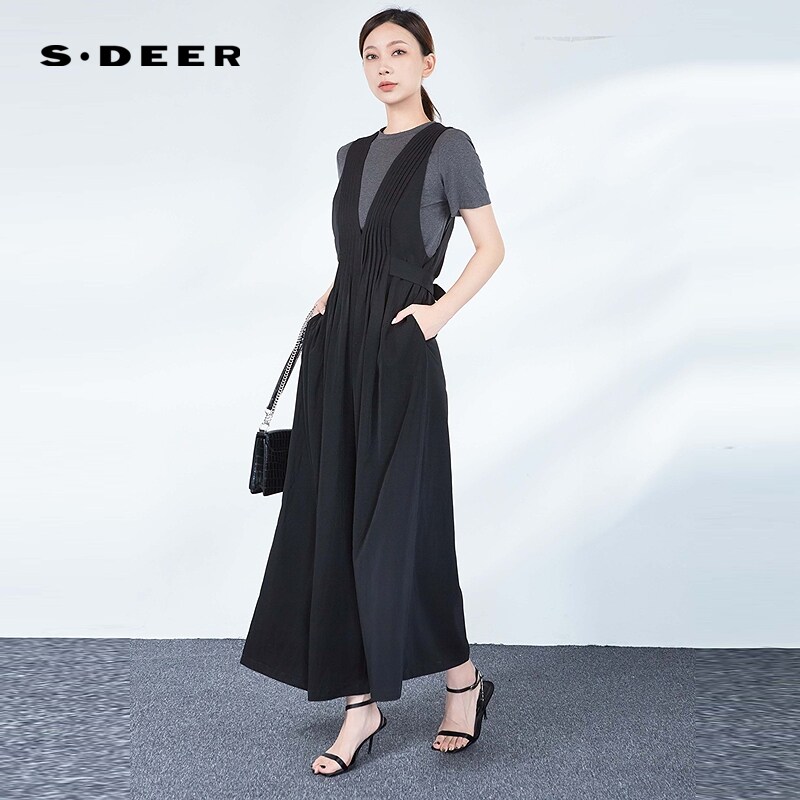 sdeer圣迪奥女装复古风琴褶收腰背带阔腿长裤S242Z1001