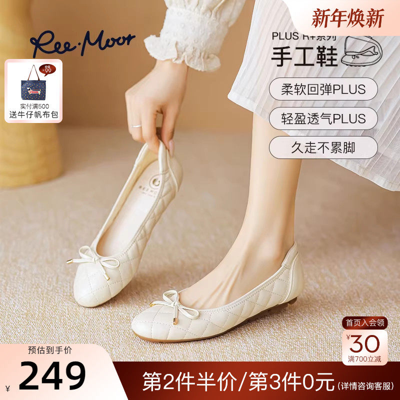REEMOOR睿慕PLUS系列2025新款格纹圆头平底浅口单鞋船鞋蛋卷鞋女