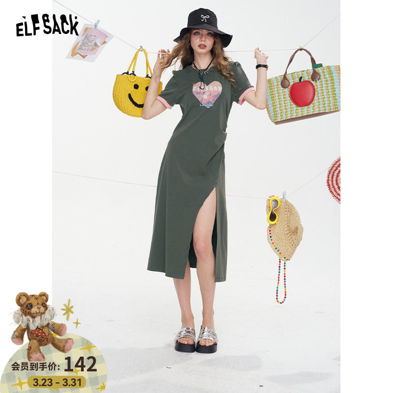 妖精的口袋爱心印花收腰抽褶连衣裙女2026夏季新款开叉休闲t恤裙