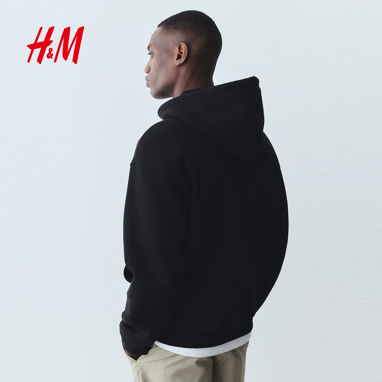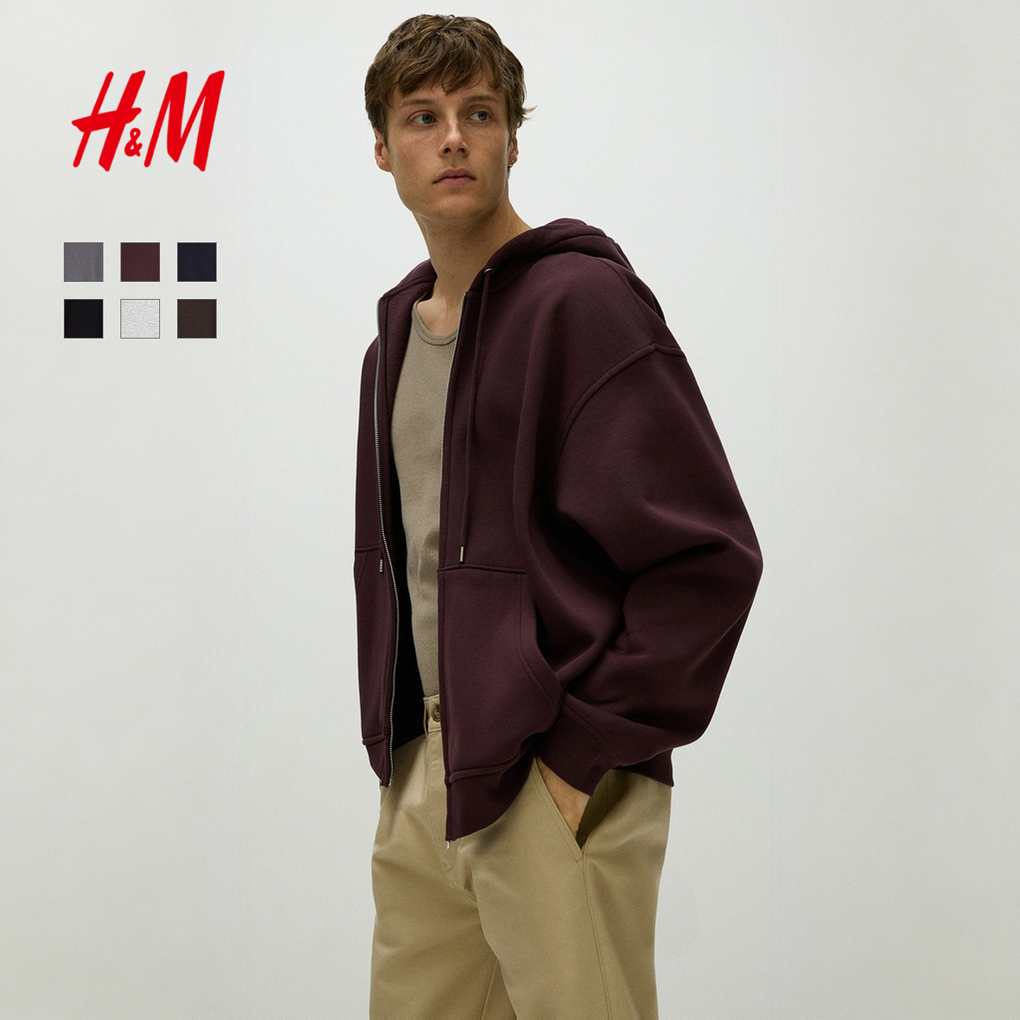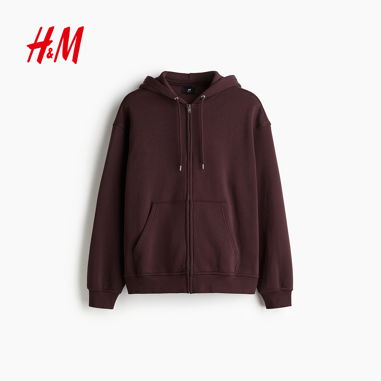 HM男装女装休闲卫衣开衫落肩宽松梅红色拉链连帽情侣衫1308010