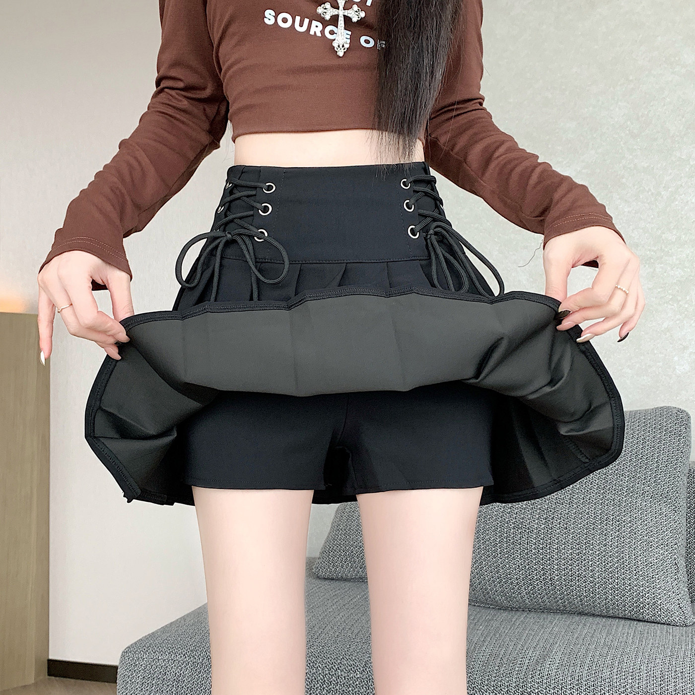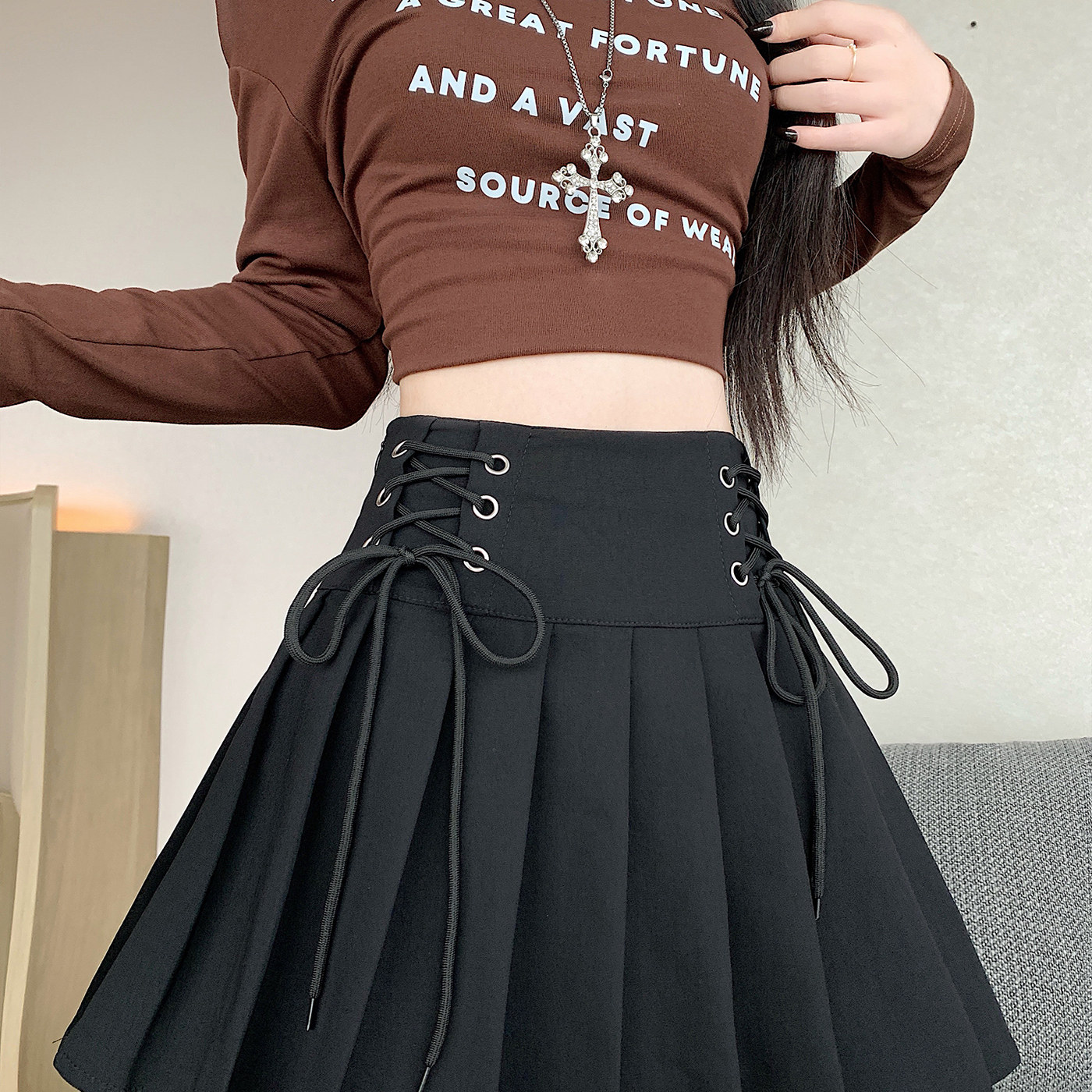 复古黑色双边绑绳子系带百褶半身裙女秋冬2025新款高腰a字短裙子