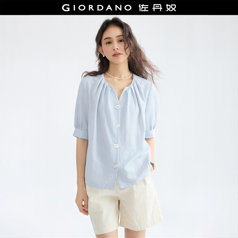 设计师款佐丹奴肌理感衬衫女新款压褶V领不规则纽扣衬衫18345507