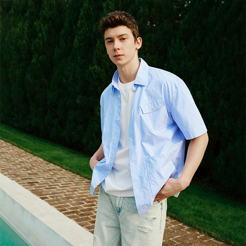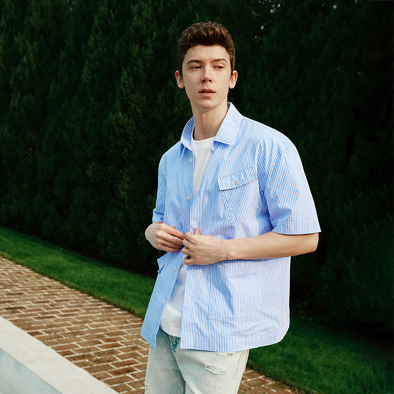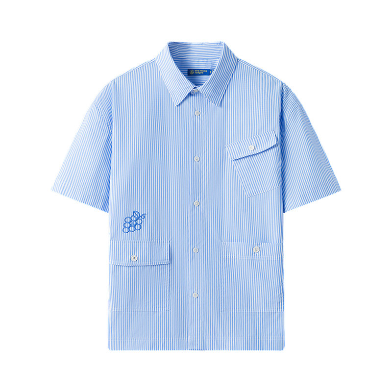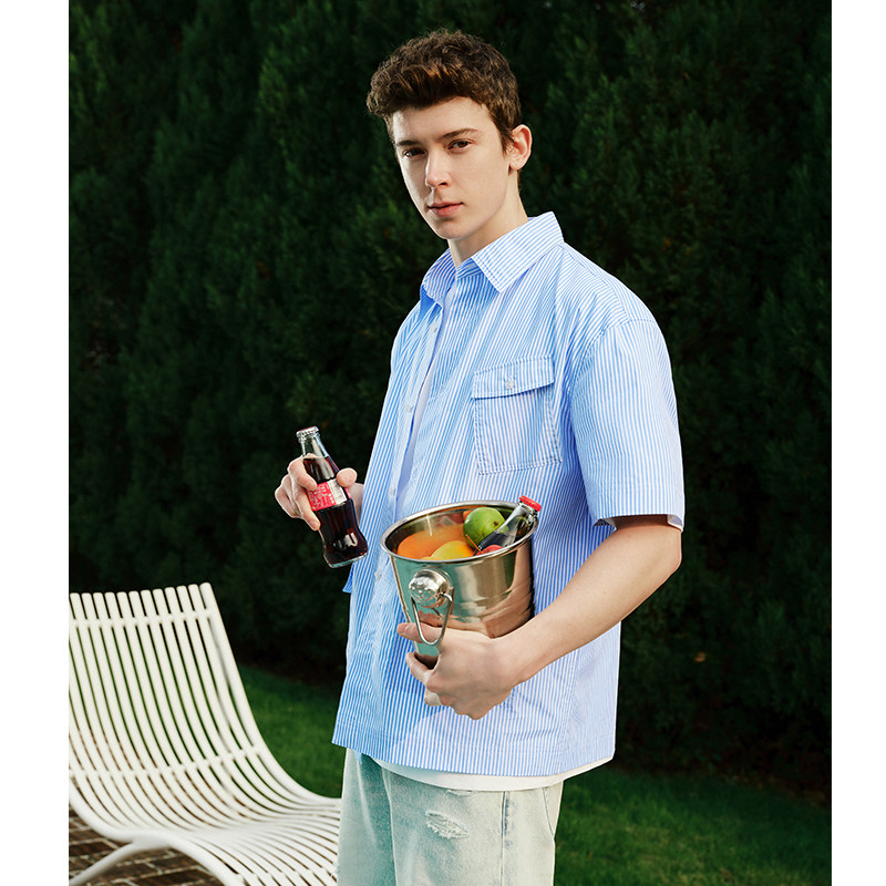 Navigare意大利小帆船蓝色纯棉短袖衬衫男士宽松条纹衬衣外套