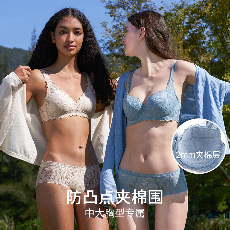 全蕾丝夹棉钢圈围+全罩杯型,视觉立体显小