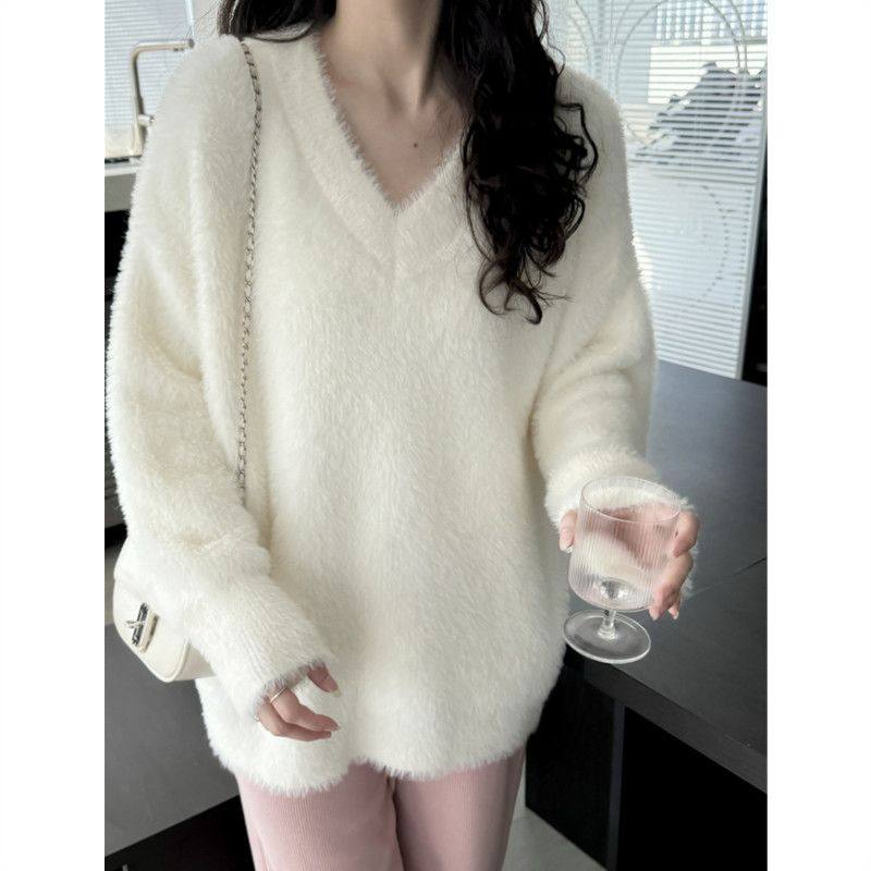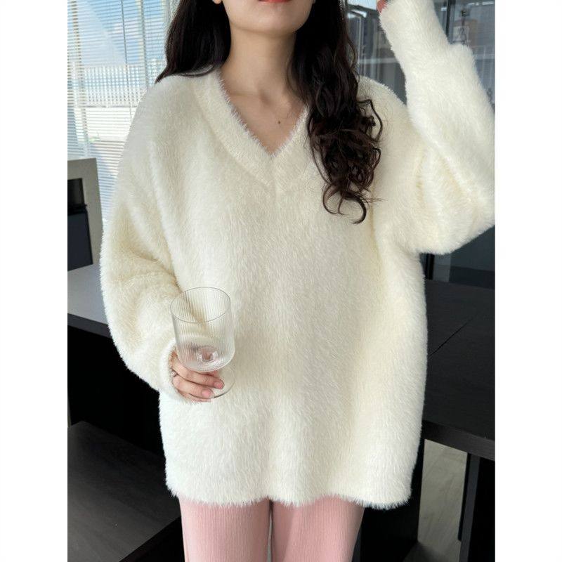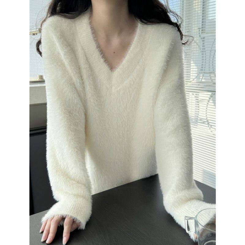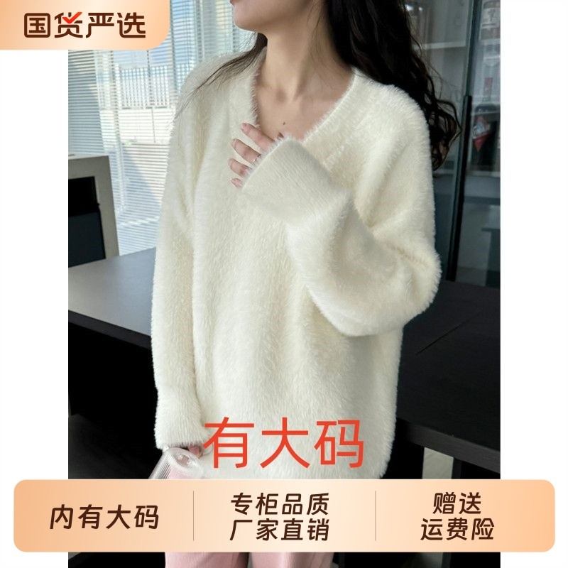 白色毛衣女秋冬慵懒风宽松v领套头水貂绒高级大码内搭针织衫上衣