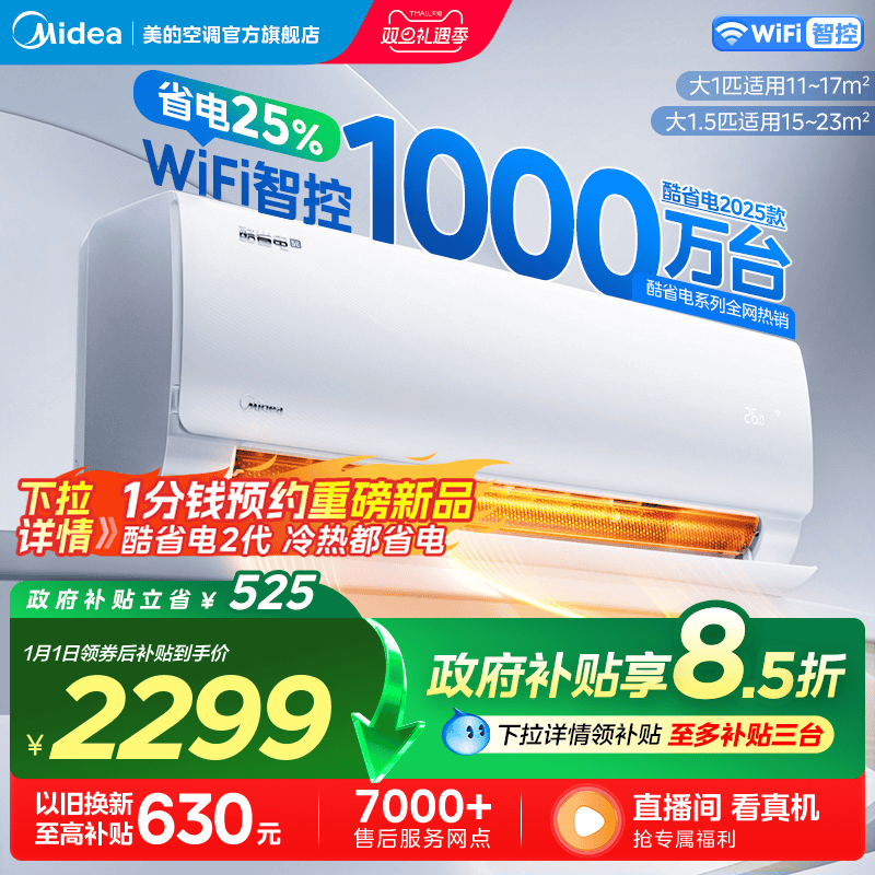美的空调酷省电Pro大1匹1.5匹一级能效变频冷暖家用挂机官方正品