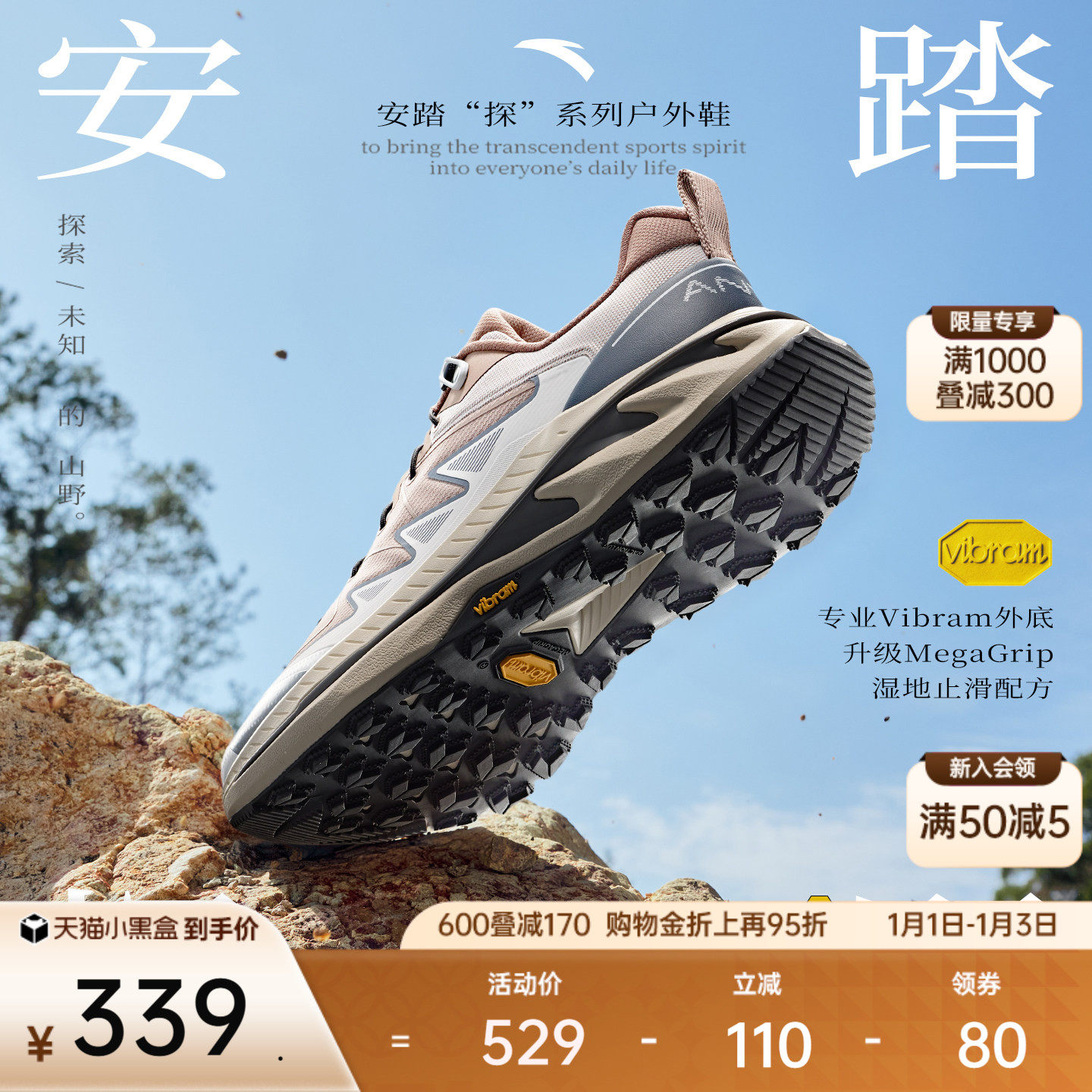 安踏探野PRO V2丨Vibram大底专业户外越野缓震耐磨跑步鞋男女同款