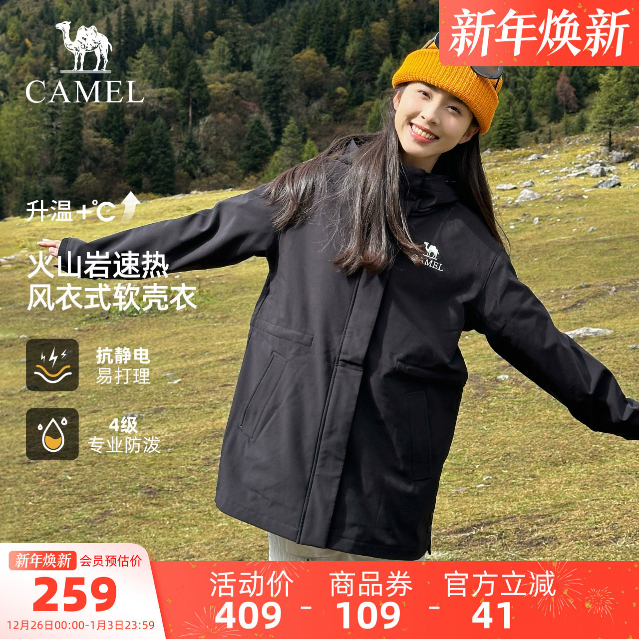 【火山岩】骆驼户外软壳衣女连帽中长款风衣速热防泼水防风外套
