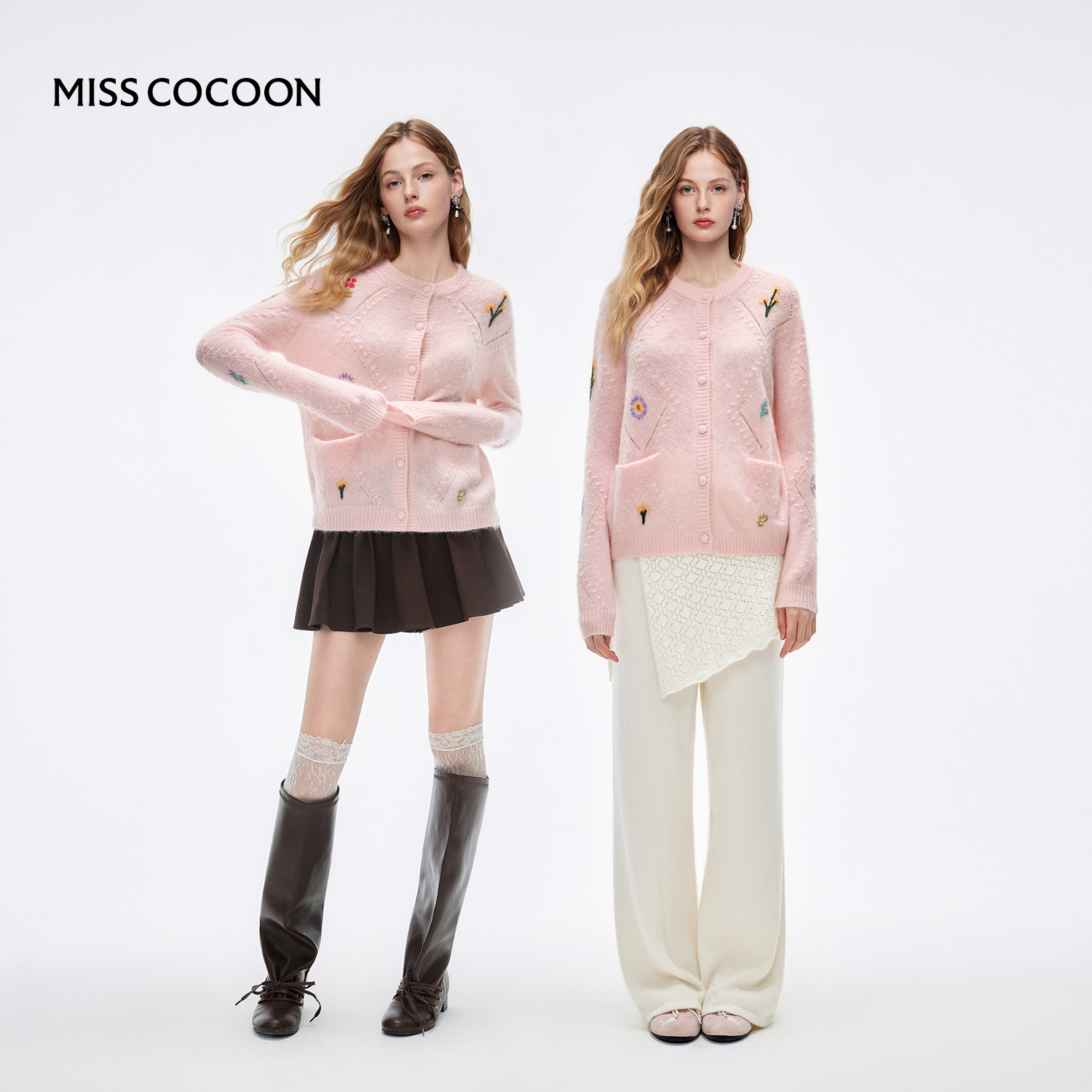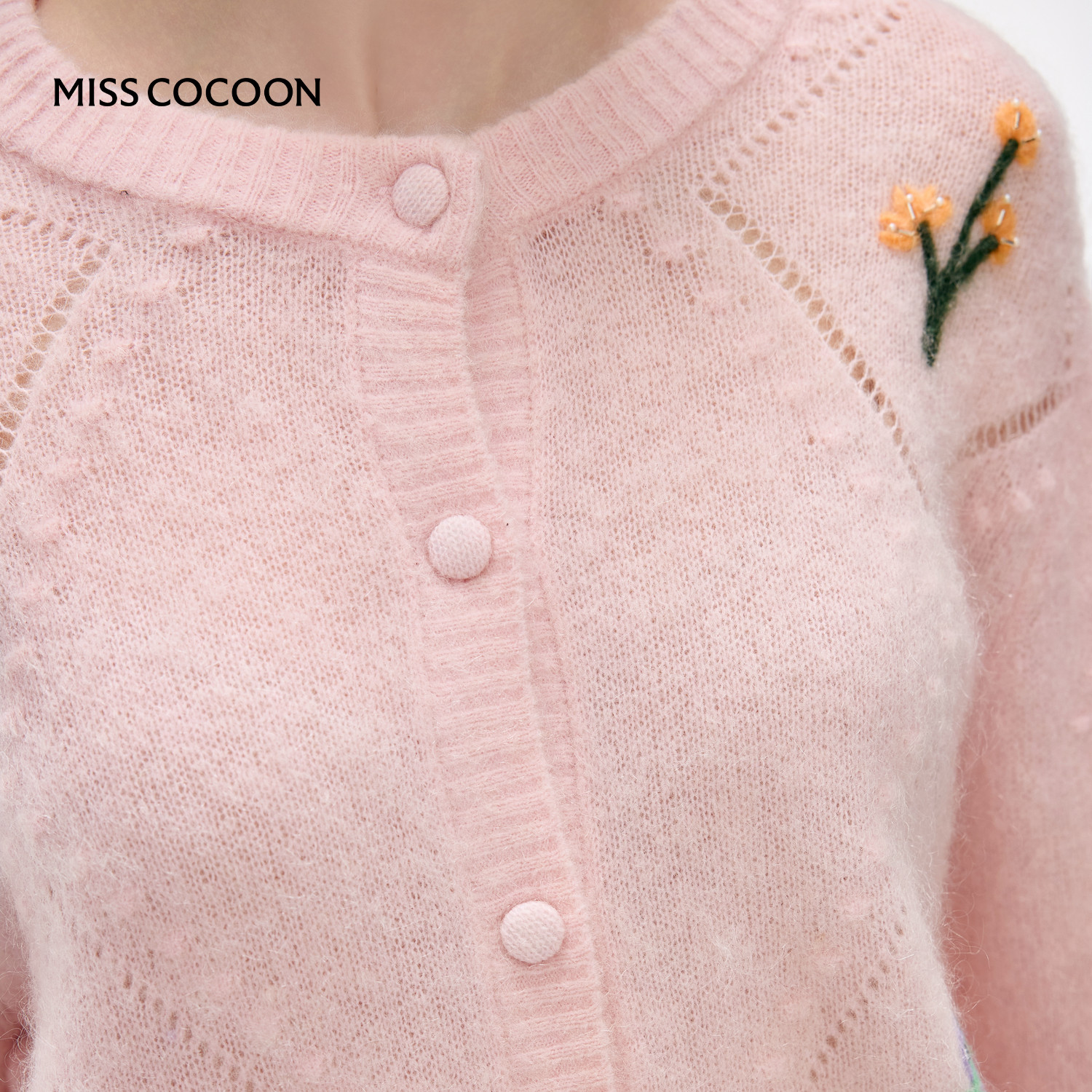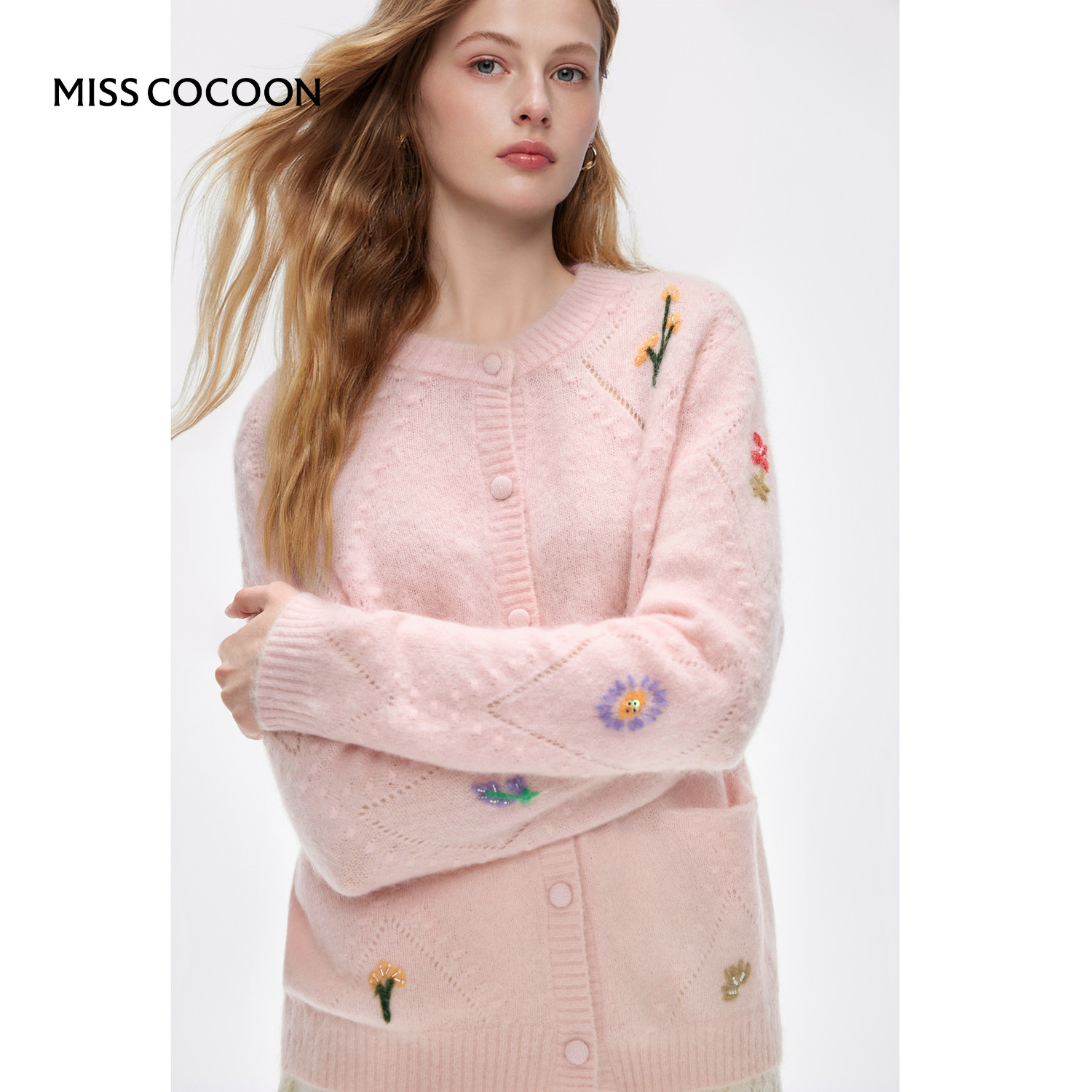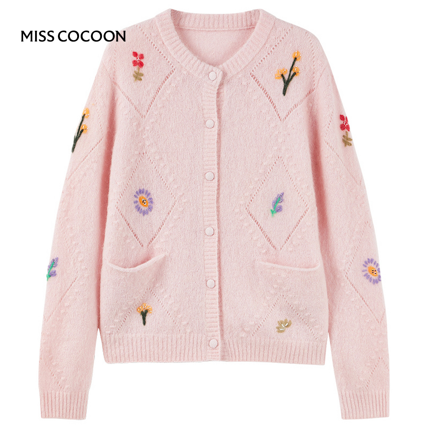 MISSCOCOON可可尼马海毛粉色开衫女2025冬季新款刺绣绵羊毛针织衫