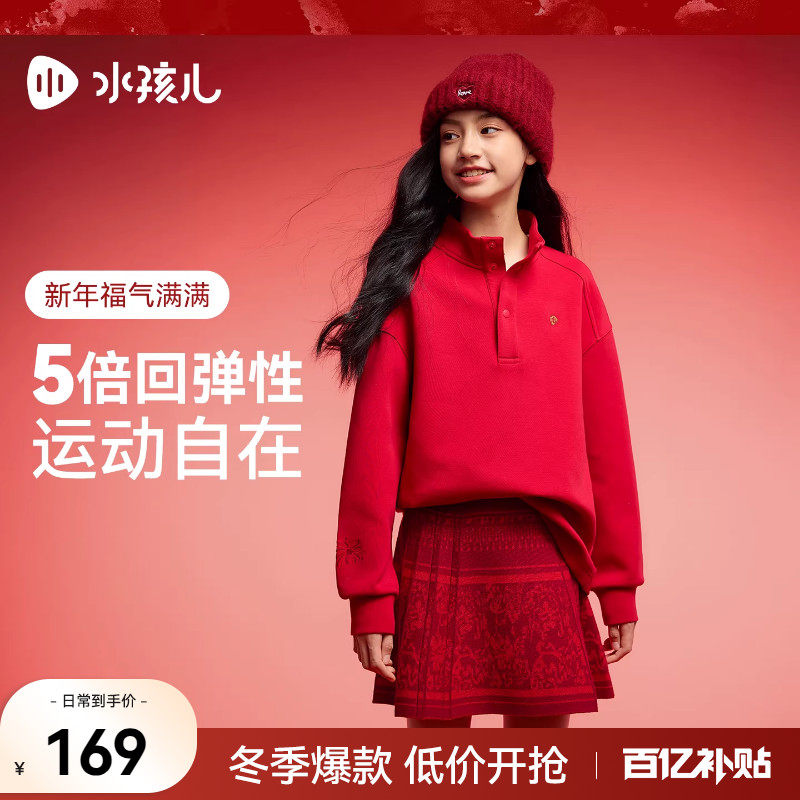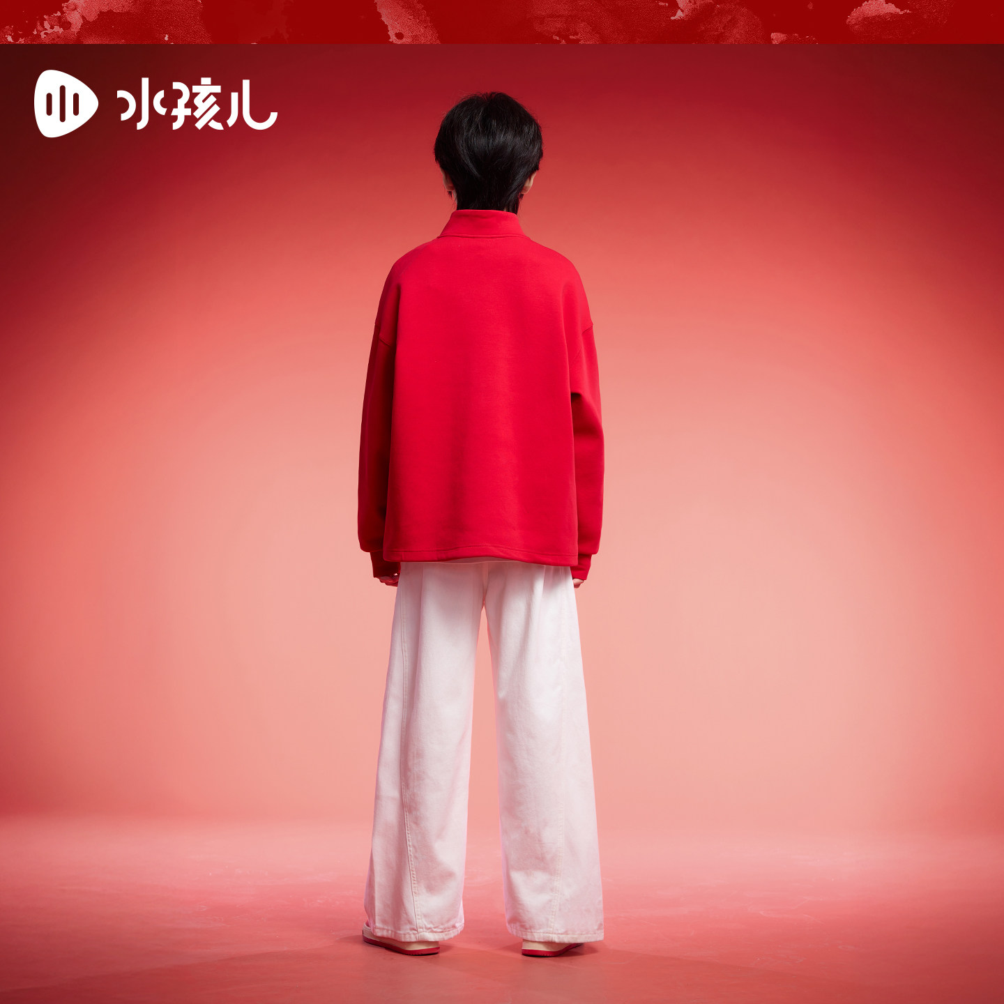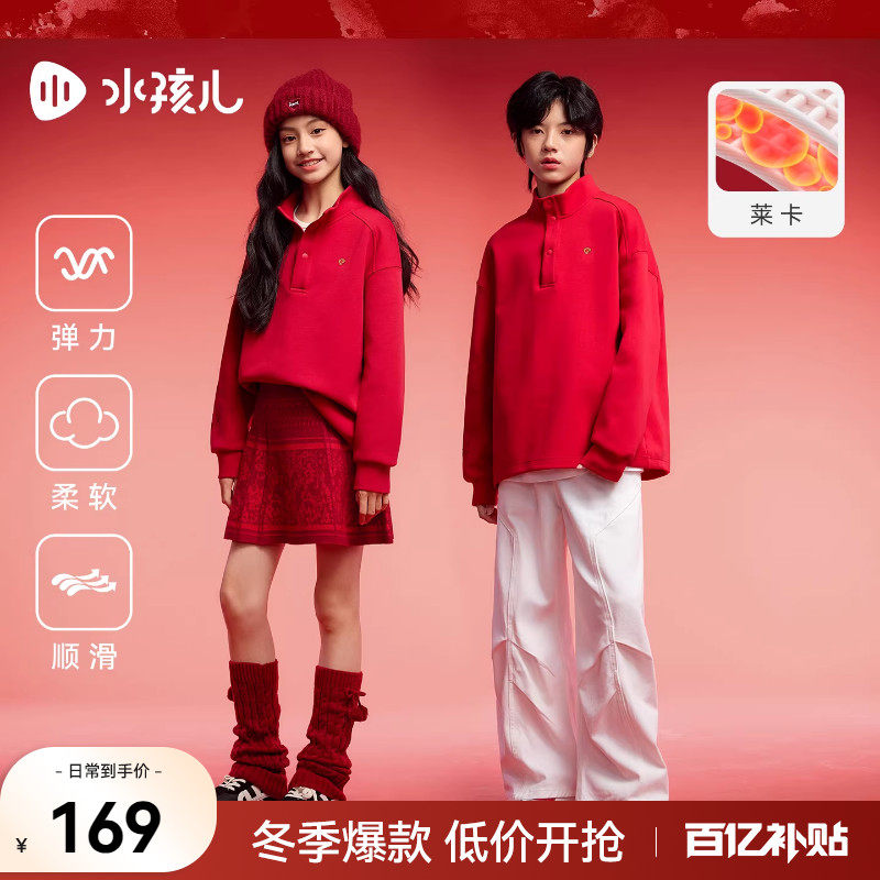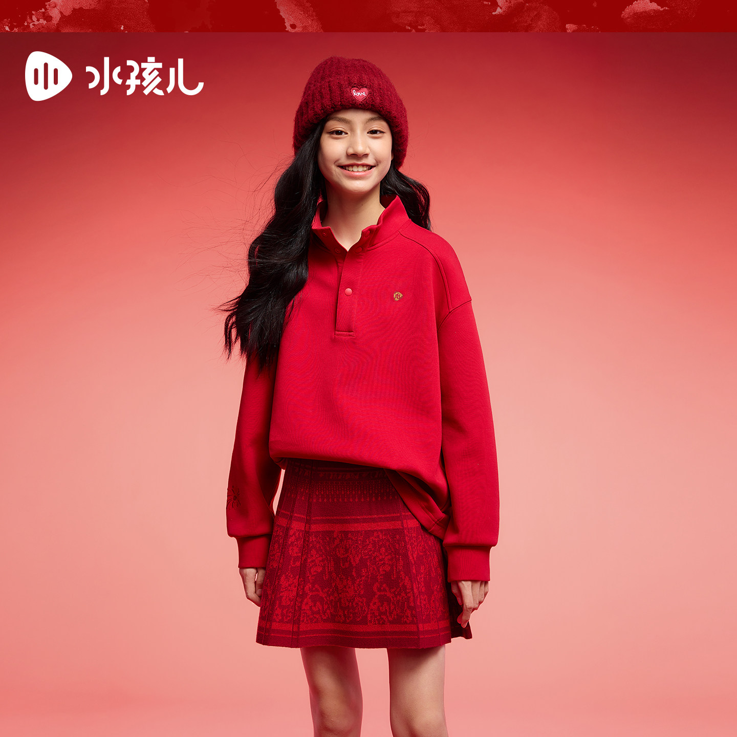 水孩儿童装卫衣2026春季新品亲子套头衫男女童新年装红色立领上衣