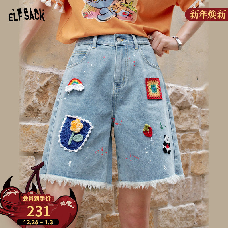 妖精的口袋立体钩花毛边牛仔裤女2025年夏季新款高腰显瘦宽松短裤