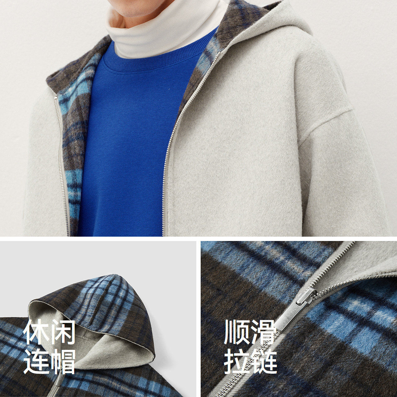 商场同款|森马毛呢外套男冬格纹双面穿2025新款情侣韩系连帽上衣
