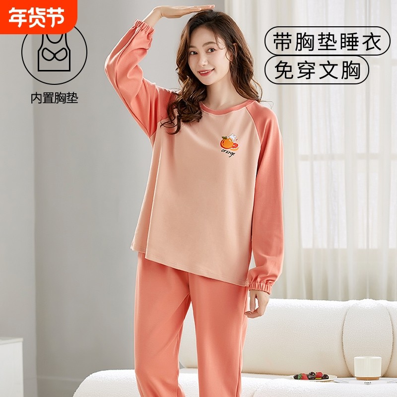 2025新款睡衣女士秋冬季长袖长裤舒适简约适合外穿带胸垫一体睡衣