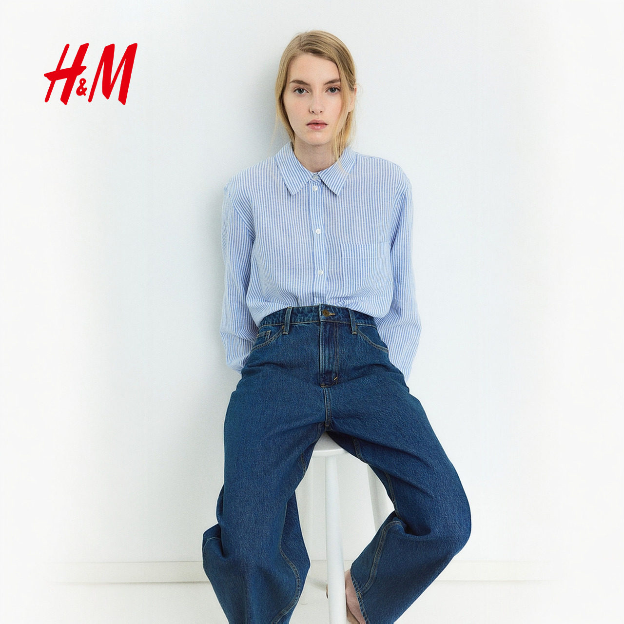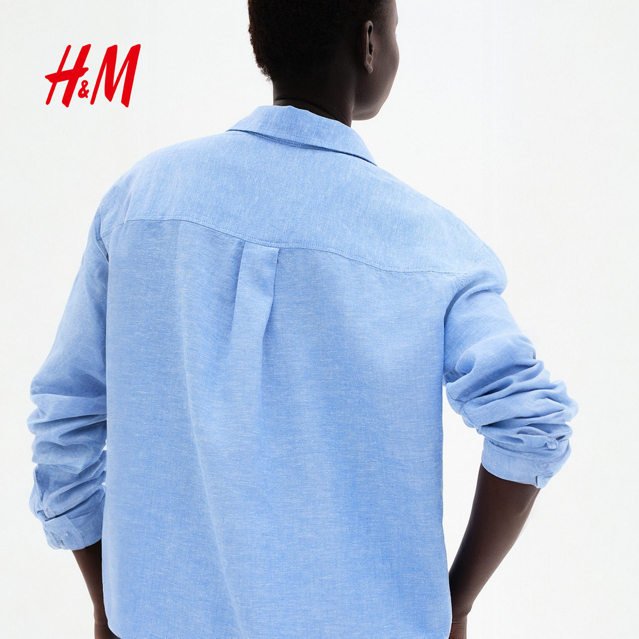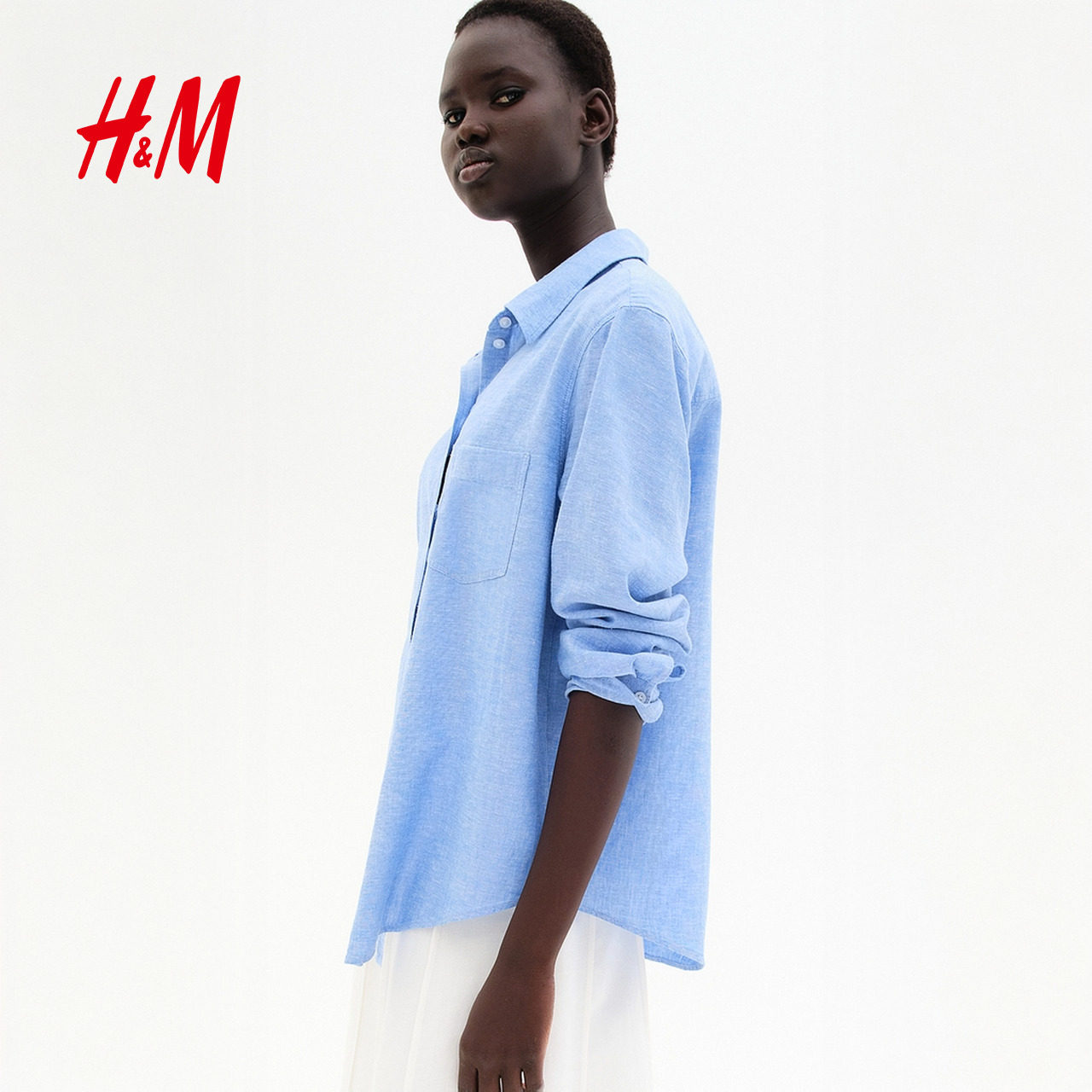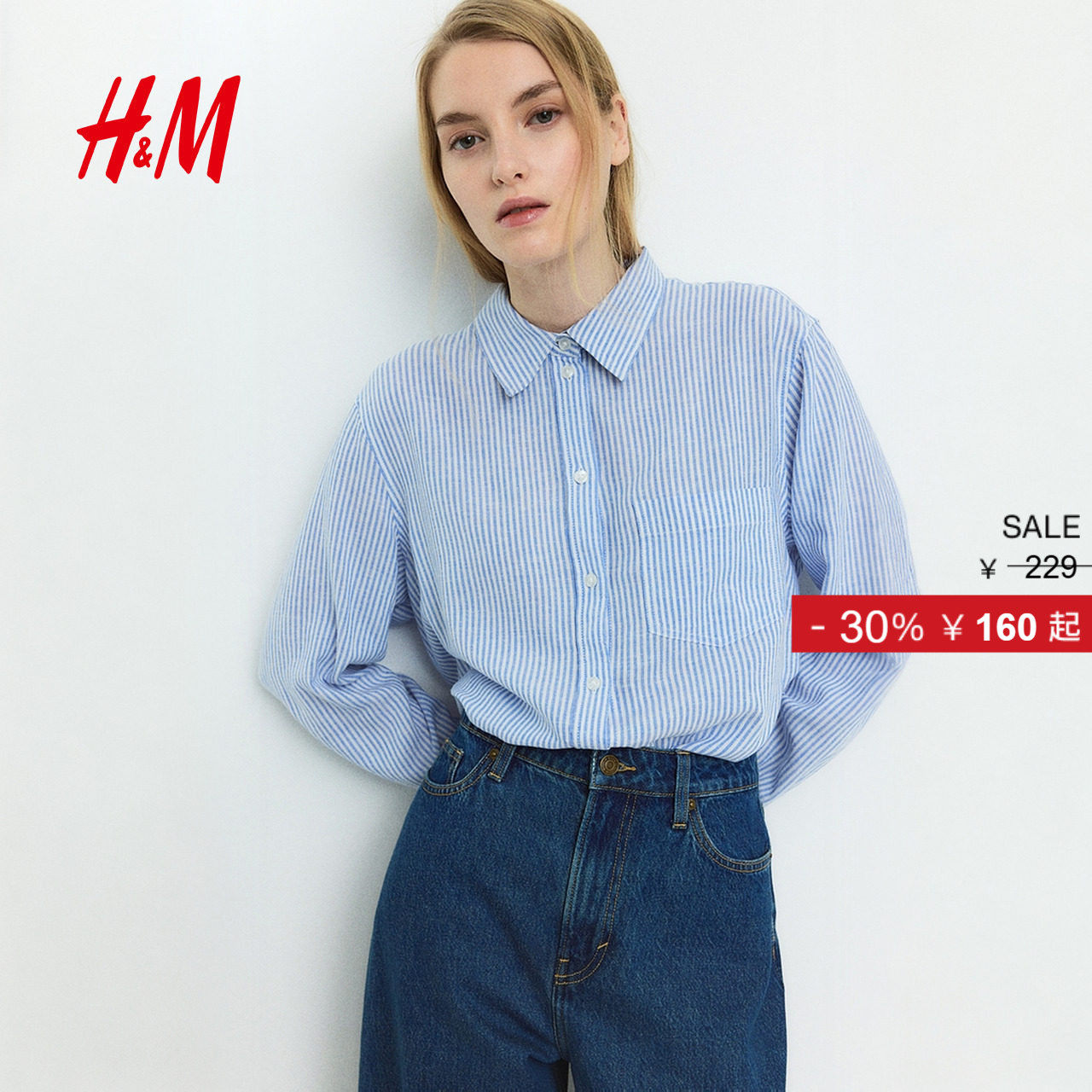 HM女装春季休闲翻折领松驰感亚麻混纺衬衫休闲舒适上衣1213682