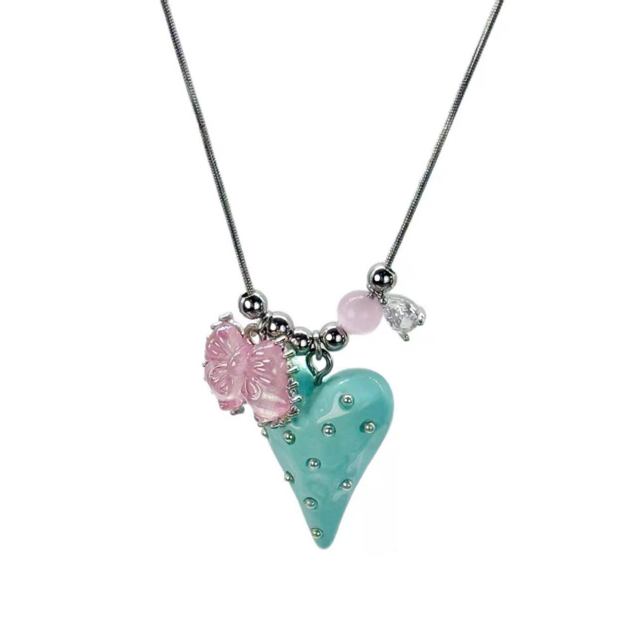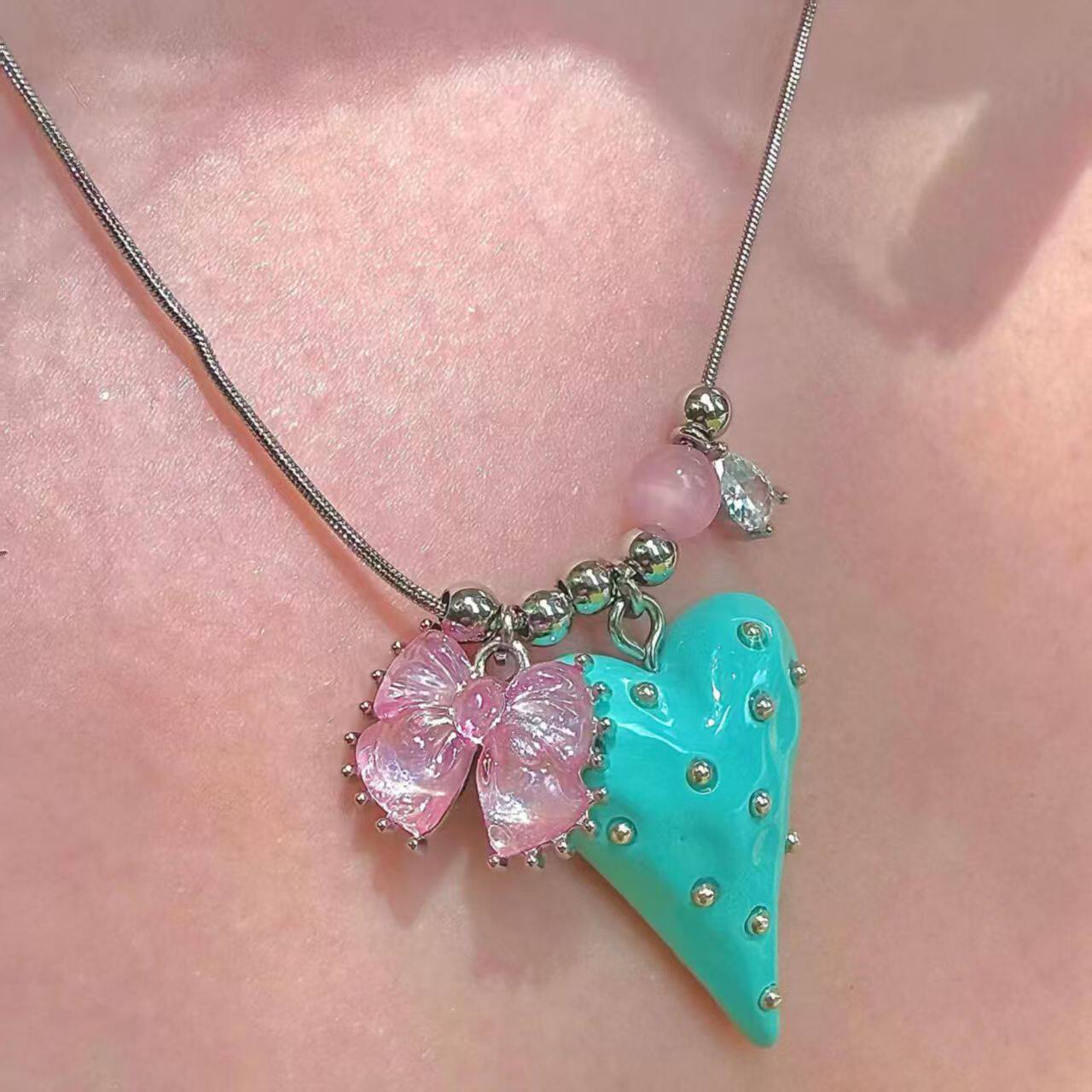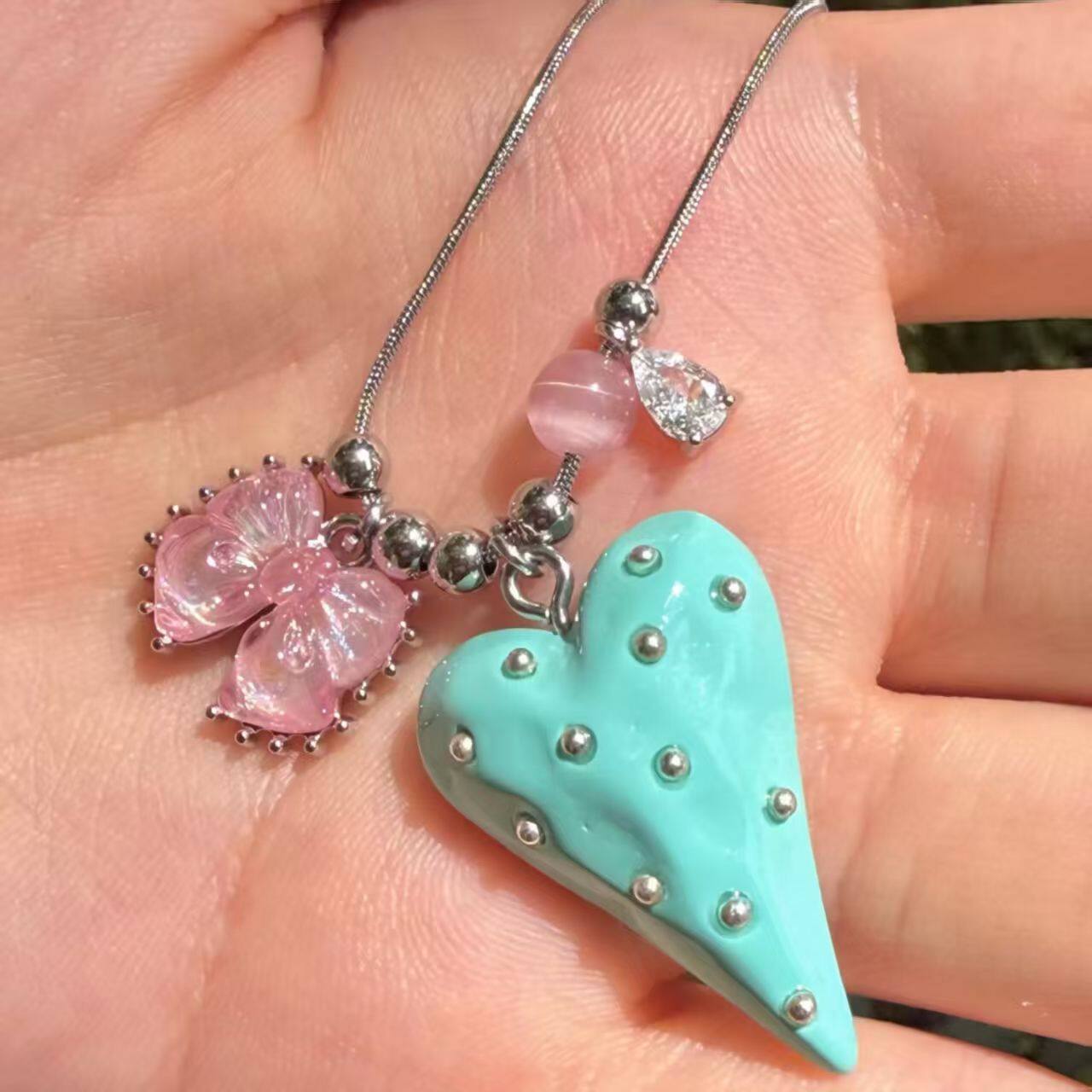 甜酷风粉蓝爱心蝴蝶结叠戴项链高级感时尚百搭锁骨链小众气质颈链
