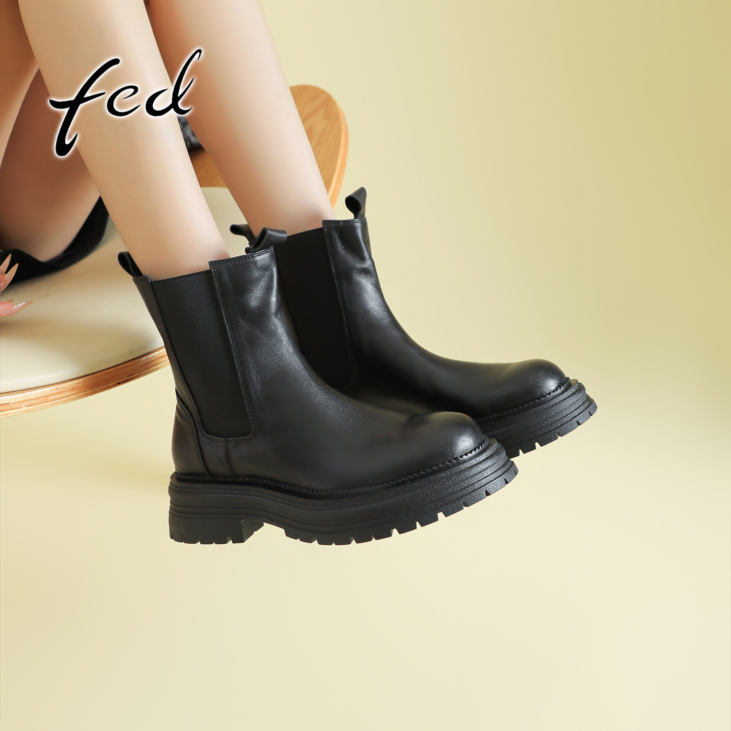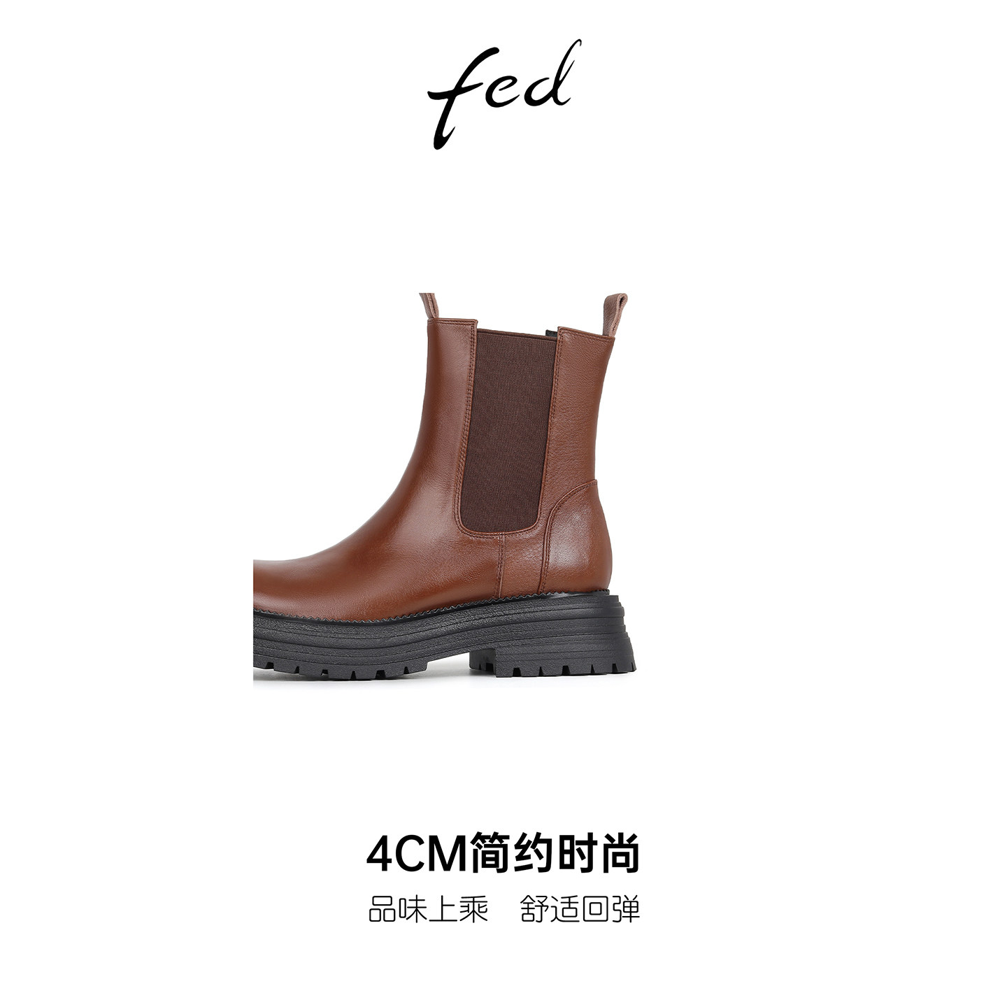 fed英伦风真皮粗跟厚底切尔西靴女复古烟筒靴秋冬款中跟圆头短靴