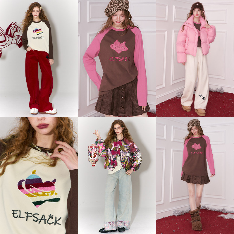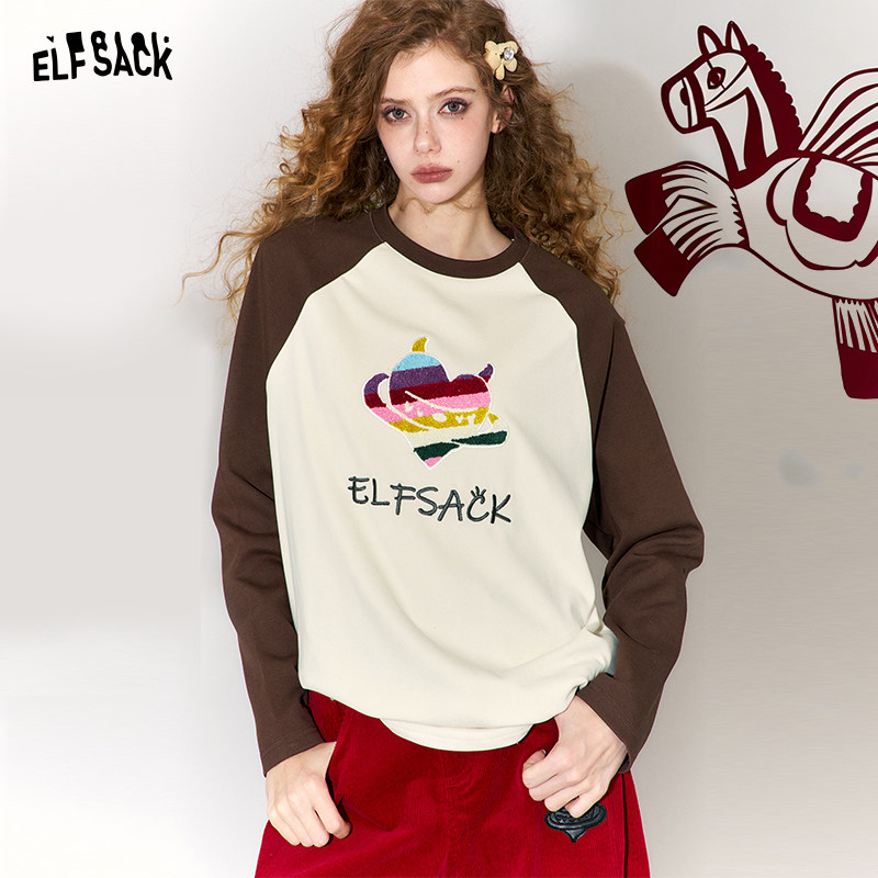 妖精的口袋插肩撞色拼接t恤女2026春秋新款休闲小众内搭宽松上衣