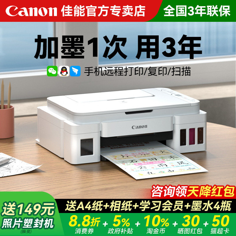 佳能G3810彩色墨仓式打印机政府补贴家用小型可连手机无线复印扫描一体机连供多功能家庭学生办公专用G3811