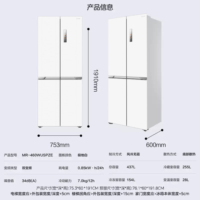 【政府补贴】美的460全自动制冰冰箱超薄嵌入式家用十字对开四门