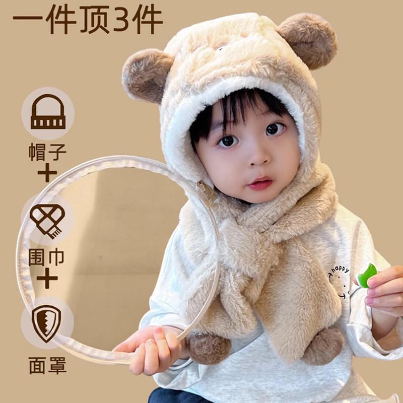 尼多熊婴儿帽子秋围脖一体宝宝毛绒帽防风护耳帽冬季保暖婴幼儿帽
