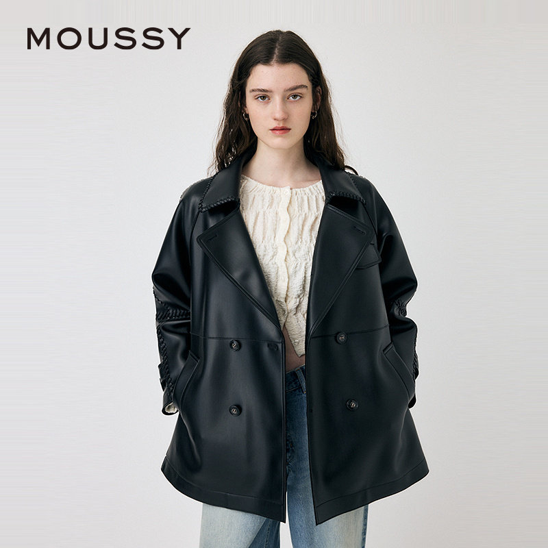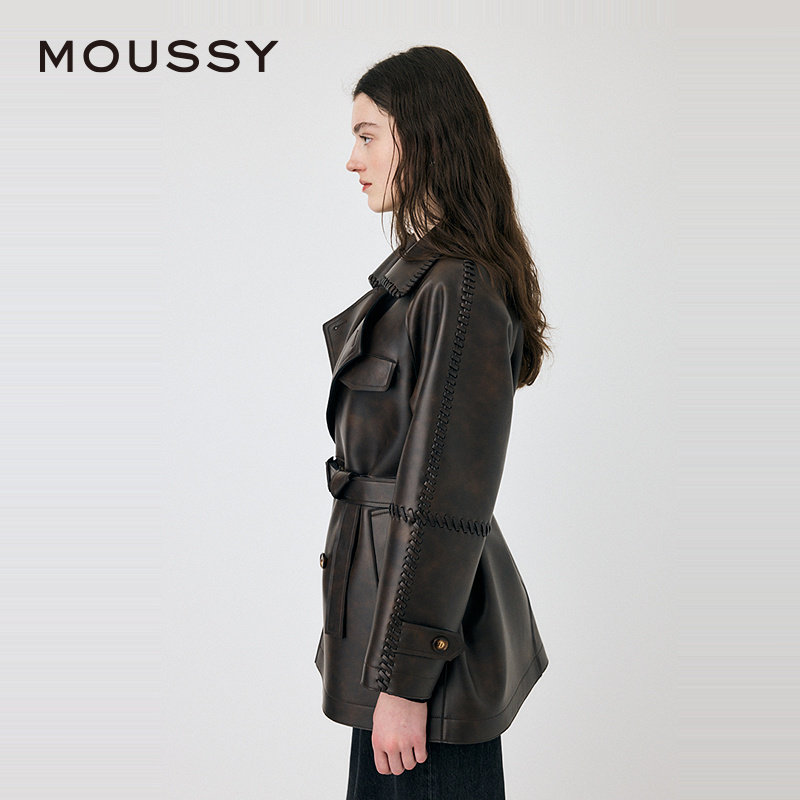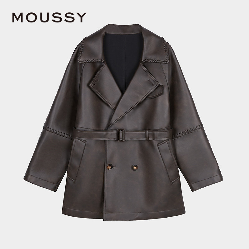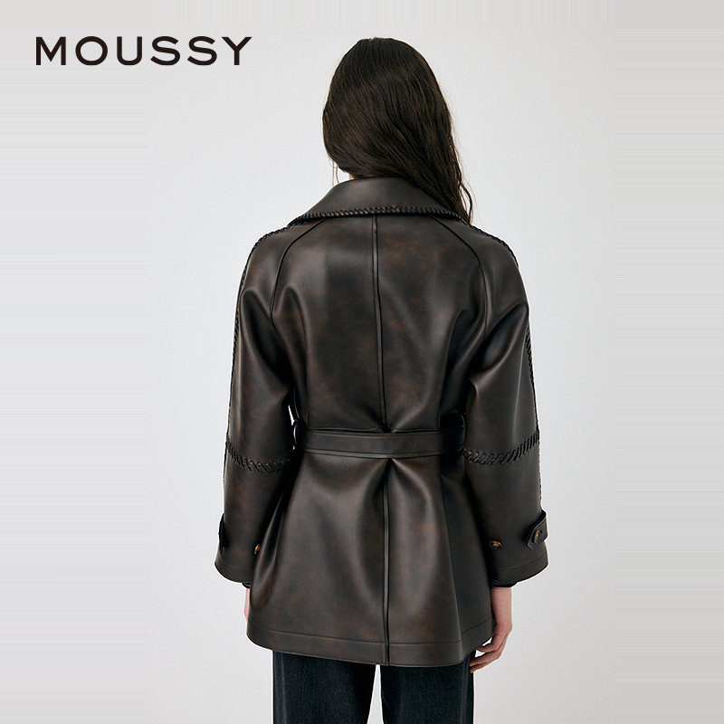 MOUSSY 2025春季新品复古港风翻领中长款皮质外套女010ISH30-0571