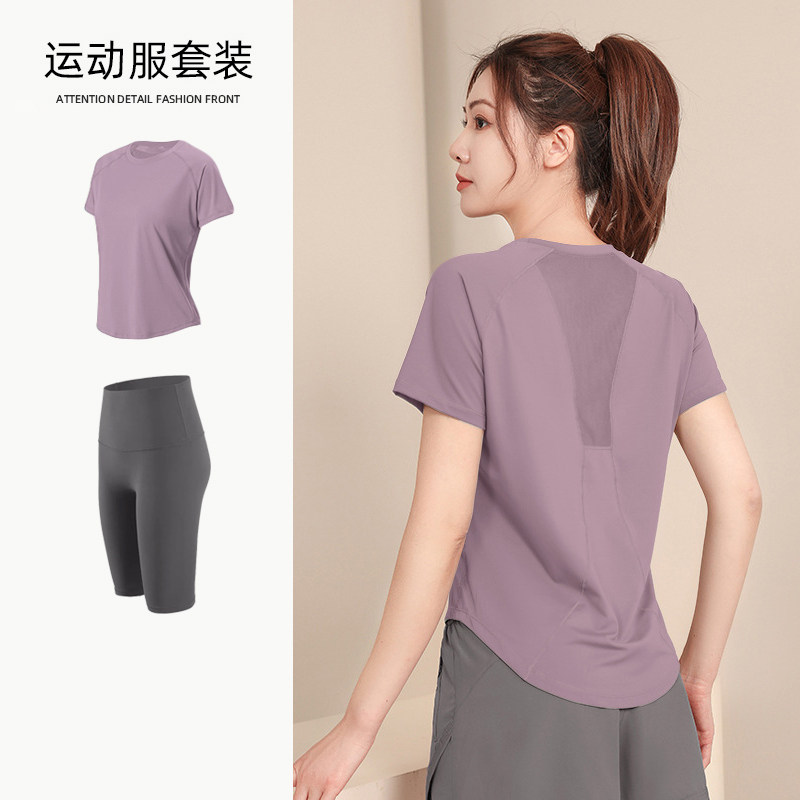 大码运动套装女夏季新款胖MM宽松速干短袖户外晨跑登山暴汗瑜伽服