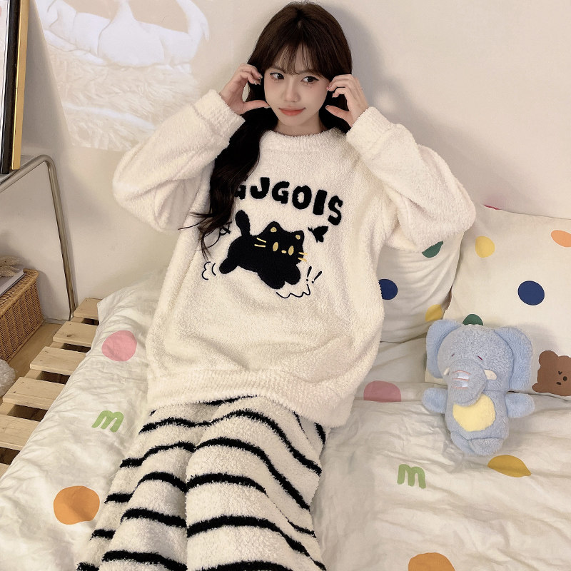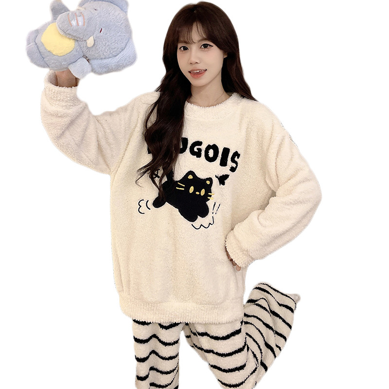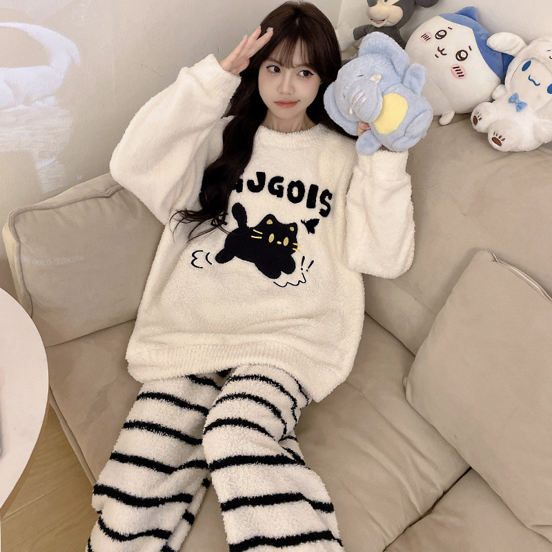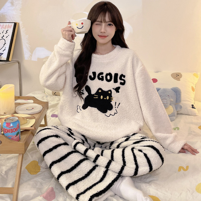 半边绒珊瑚绒睡衣女款秋冬季卡通小猫加绒加厚新款可爱女士家居服